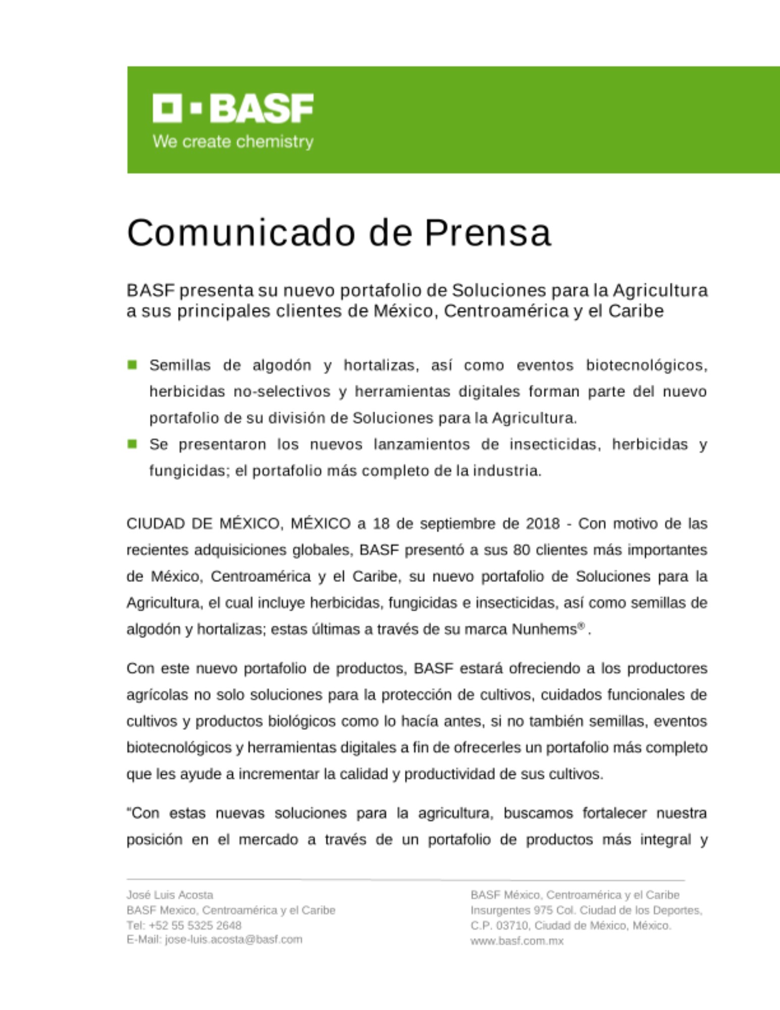 CIUDAD DE MÉXICO, MÉXICO a 18 de septiembre de 2018 - Con motivo de las recientes adquisiciones globales, BASF presentó a sus 80 clientes más importantes de México, Centroamérica y el Caribe, su nuevo portafolio de Soluciones para la Agricultura, el cual incluye herbicidas, fungicidas e insecticidas, así como semillas de algodón y hortalizas; estas últimas a través de su marca Nunhems® .