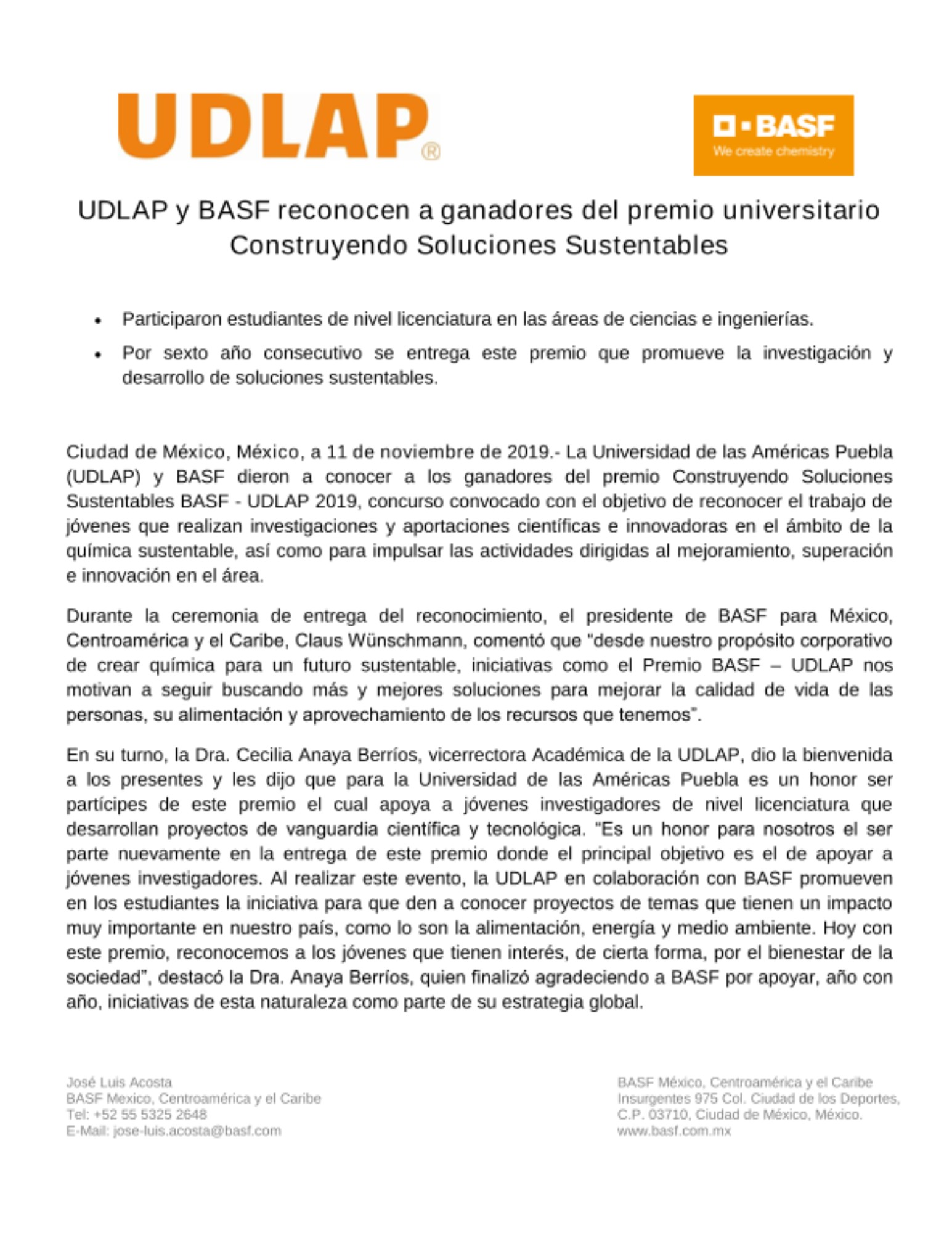 Finalmente, cabe mencionar que, desde hace más de 7 años BASF y la Universidad de las Américas Puebla convocan a la participación a este concurso, siendo este 2019 el sexto año que se entrega el premio BASF - UDLAP, el cual tiene como propósito despertar el interés de los jóvenes en la creación y aplicación de proyectos sustentables basados en temas como recursos naturales, medio ambiente y clima, alimentación y seguridad alimentaria, y calidad de vida que garanticen el cuidado del medio ambiente y el futuro del mundo con la finalizad de mejorar la calidad de vida de la sociedad.