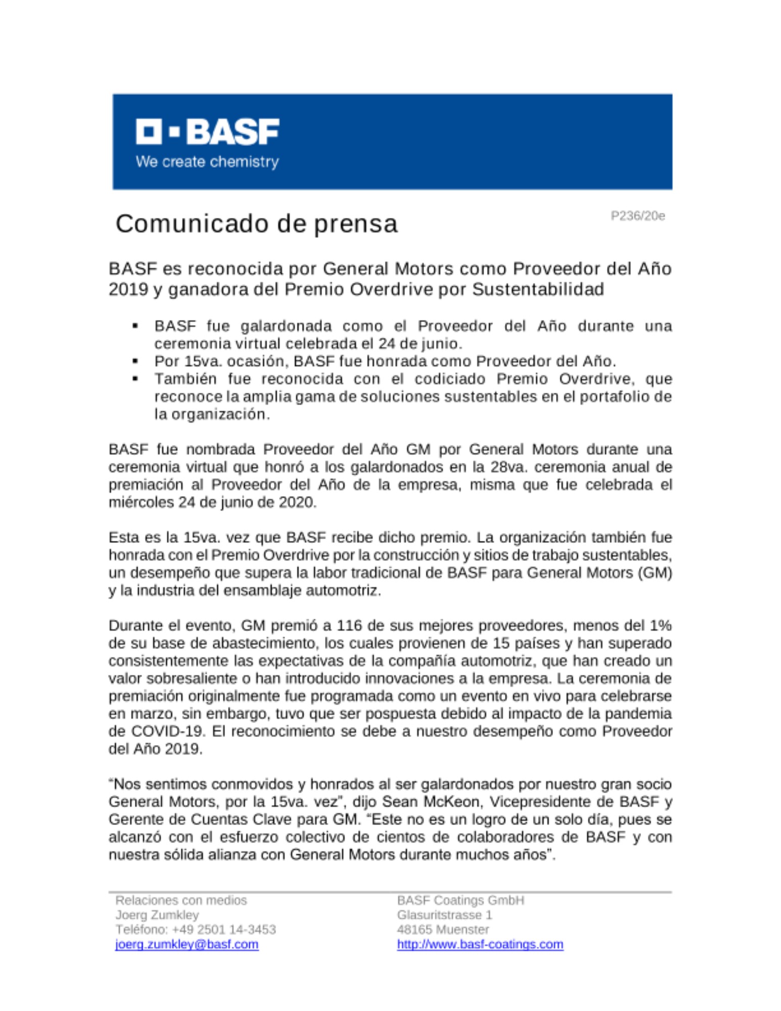 “El portafolio de BASF no solo consta de pintura, catalizadores, plásticos o líquidos para uso automotriz”, indicó McKeon. “Gracias, General Motors, por permitirnos ofrecerles soluciones sustentables que tienen un alcance más allá de la industria automotriz. Este Premio Overdrive tendrá un lugar de gran honor en el legado de nuestra empresa”. Nos recordará constantemente que nuestra estrategia con múltiples puntos y enfoque en el cliente se encuentra encausada en la dirección correcta”.