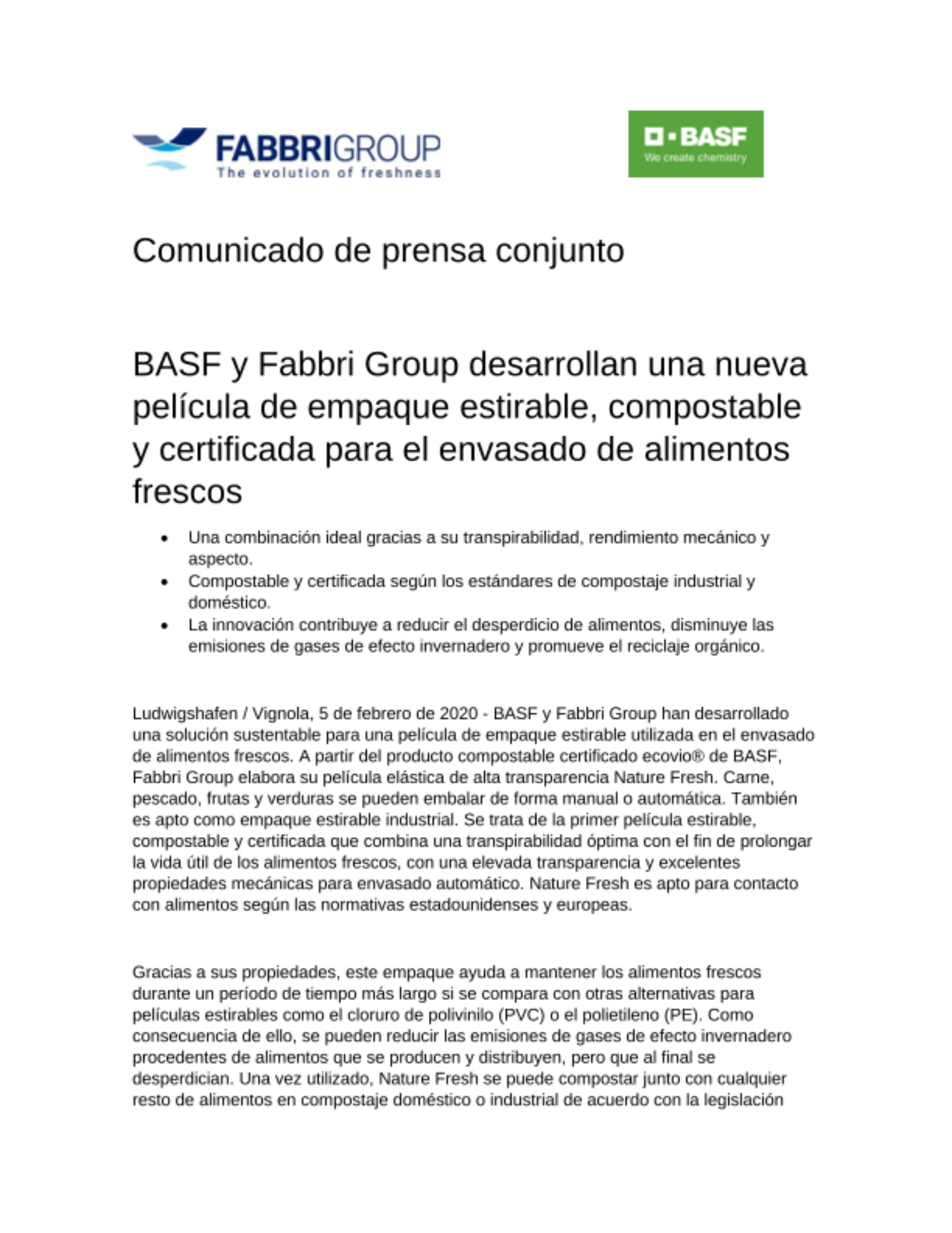 Ludwigshafen / Vignola, 5 de febrero de 2020 - BASF y Fabbri Group han desarrollado una solución sustentable para una película de empaque estirable utilizada en el envasado de alimentos frescos. A partir del producto compostable certificado ecovio® de BASF, Fabbri Group elabora su película elástica de alta transparencia Nature Fresh. Carne, pescado, frutas y verduras se pueden embalar de forma manual o automática. También es apto como empaque estirable industrial. Se trata de la primer película estirable, compostable y certificada que combina una transpirabilidad óptima con el fin de prolongar la vida útil de los alimentos frescos, con una elevada transparencia y excelentes propiedades mecánicas para envasado automático. Nature Fresh es apto para contacto con alimentos según las normativas estadounidenses y europeas.