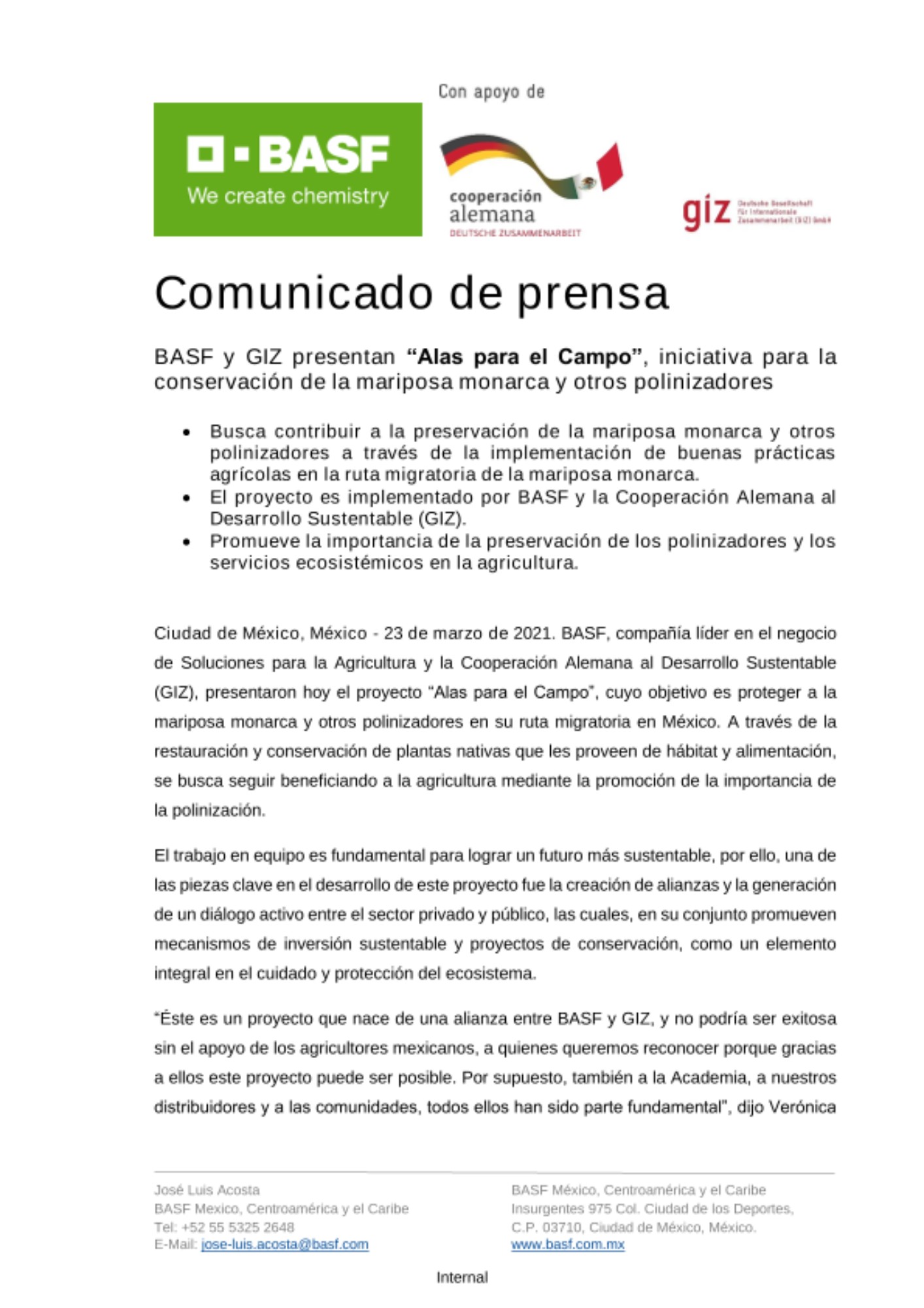 Ciudad de México, México - 23 de marzo de 2021. BASF, compañía líder en el negocio de Soluciones para la Agricultura y la Cooperación Alemana al Desarrollo Sustentable (GIZ), presentaron hoy el proyecto “Alas para el Campo”, cuyo objetivo es proteger a la mariposa monarca y otros polinizadores en su ruta migratoria en México. A través de la restauración y conservación de plantas nativas que les proveen de hábitat y alimentación, se busca seguir beneficiando a la agricultura mediante la promoción de la importancia de la polinización.