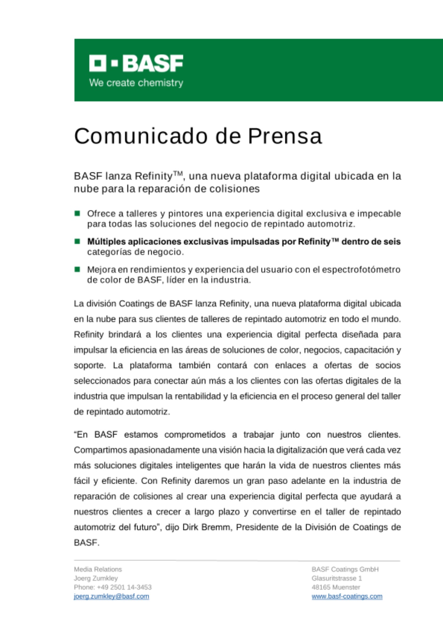 “En BASF estamos comprometidos a trabajar junto con nuestros clientes. Compartimos apasionadamente una visión hacia la digitalización que verá cada vez más soluciones digitales inteligentes que harán la vida de nuestros clientes más fácil y eficiente. Con Refinity daremos un gran paso adelante en la industria de reparación de colisiones al crear una experiencia digital perfecta que ayudará a nuestros clientes a crecer a largo plazo y convertirse en el taller de repintado automotriz del futuro”, dijo Dirk Bremm, Presidente de la División de Coatings de BASF.