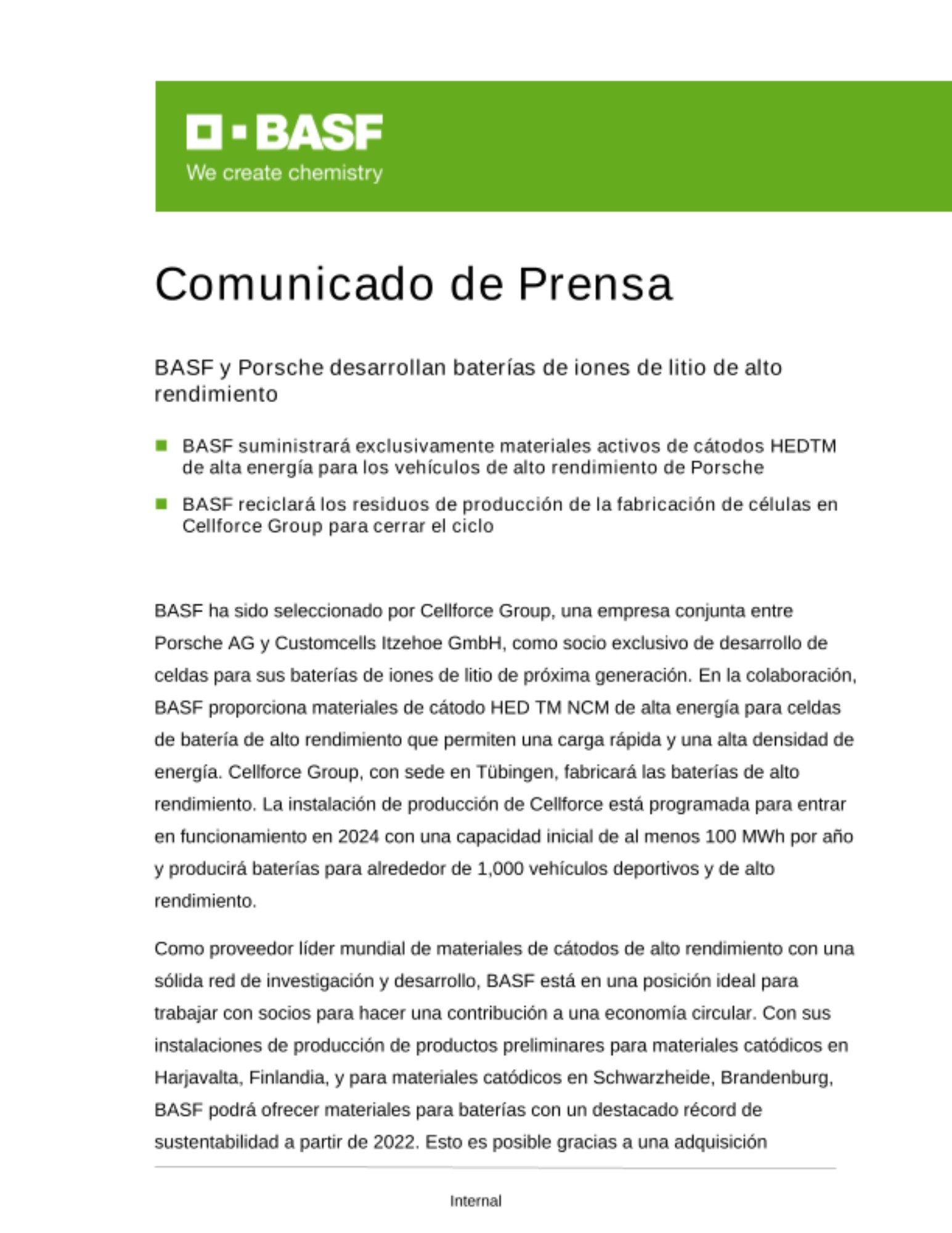En 2030, como fabricante de automóviles, a Porsche le gustaría ser neutral en materia de CO2 en el balance. Una baja huella CO2 bajo, el reciclaje de circuito cerrado y la sustentabilidad están cada vez más en primer plano”, dice Michael Steiner, miembro de la Junta de Investigación y Desarrollo de Porsche AG. “Trabajar con BASF es una situación en la que todos ganan. Las fuentes europeas de los materiales níquel y cobalto, la seguridad de suministro asociada y las rutas de transporte cortas desde Schwarzheide a Baden-Württemberg fueron todos argumentos importantes para la decisión de trabajar con BASF. Las celdas de la batería, especialmente los materiales del cátodo son el foco de las consideraciones. Estamos muy contentos de trabajar con BASF para llevar una tecnología de celdas ecológica a la producción en serie ".