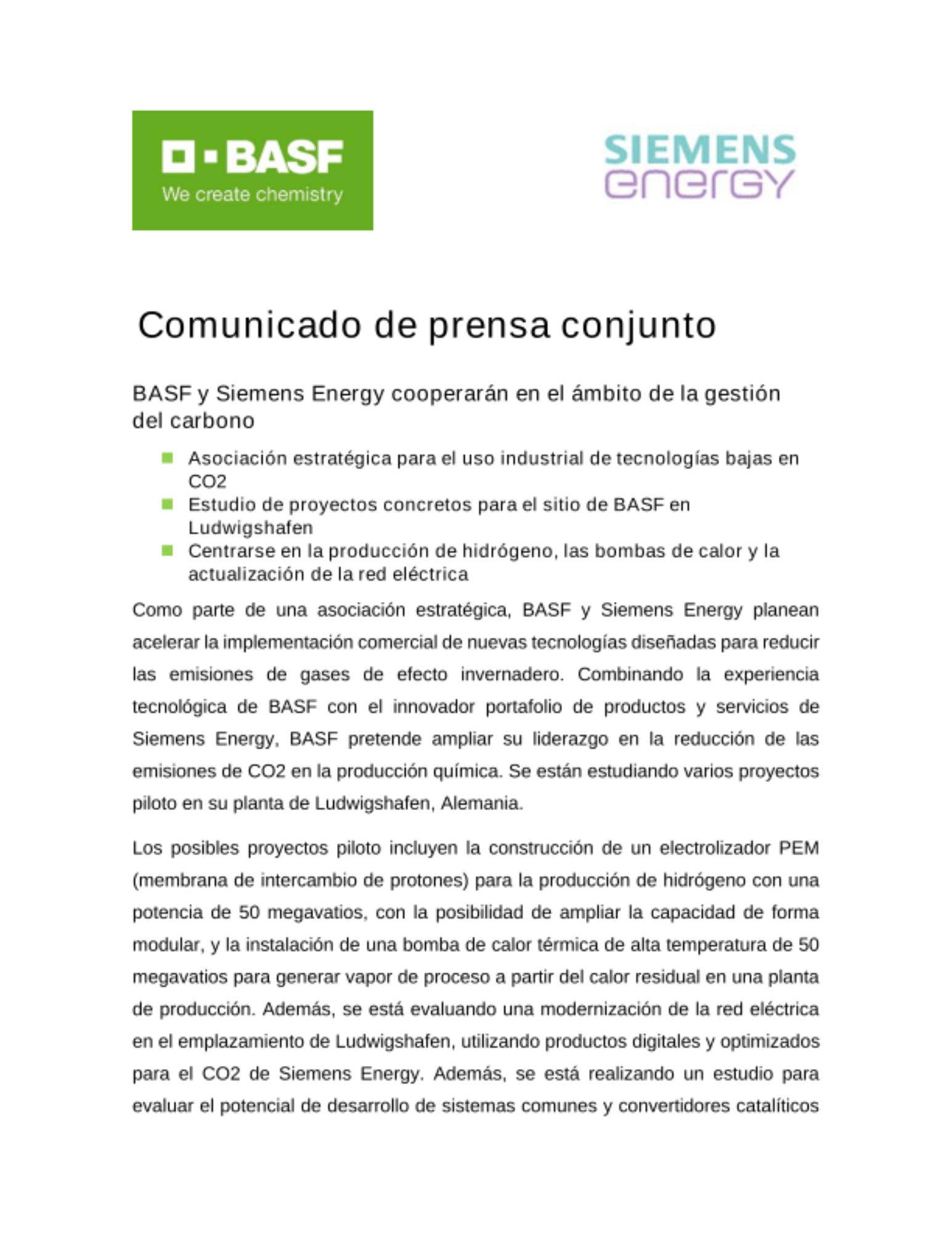 Como parte de una asociación estratégica, BASF y Siemens Energy planean acelerar la implementación comercial de nuevas tecnologías diseñadas para reducir las emisiones de gases de efecto invernadero. Combinando la experiencia tecnológica de BASF con el innovador portafolio de productos y servicios de Siemens Energy, BASF pretende ampliar su liderazgo en la reducción de las emisiones de CO2 en la producción química. Se están estudiando varios proyectos piloto en su planta de Ludwigshafen, Alemania.