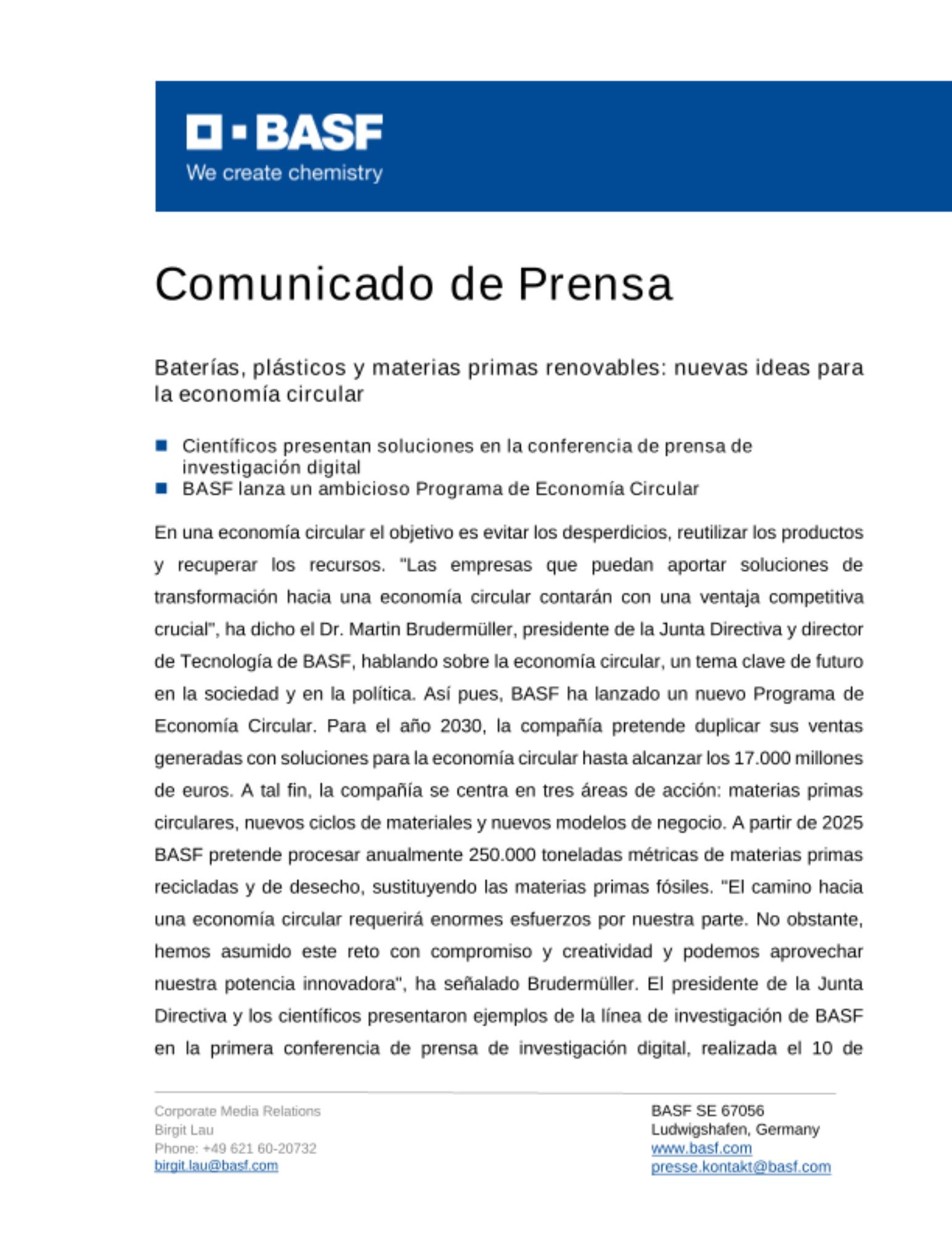 En una economía circular el objetivo es evitar los desperdicios, reutilizar los productos y recuperar los recursos. "Las empresas que puedan aportar soluciones de transformación hacia una economía circular contarán con una ventaja competitiva crucial", ha dicho el Dr. Martin Brudermüller, presidente de la Junta Directiva y director de Tecnología de BASF, hablando sobre la economía circular, un tema clave de futuro en la sociedad y en la política. Así pues, BASF ha lanzado un nuevo Programa de Economía Circular. Para el año 2030, la compañía pretende duplicar sus ventas generadas con soluciones para la economía circular hasta alcanzar los 17.000 millones de euros. A tal fin, la compañía se centra en tres áreas de acción: materias primas circulares, nuevos ciclos de materiales y nuevos modelos de negocio. A partir de 2025 BASF pretende procesar anualmente 250.000 toneladas métricas de materias primas recicladas y de desecho, sustituyendo las materias primas fósiles. "El camino hacia una economía circular requerirá enormes esfuerzos por nuestra parte. No obstante, hemos asumido este reto con compromiso y creatividad y podemos aprovechar nuestra potencia innovadora", ha señalado Brudermüller. El presidente de la Junta Directiva y los científicos presentaron ejemplos de la línea de investigación de BASF en la primera conferencia de prensa de investigación digital, realizada el 10 de diciembre de 2020.