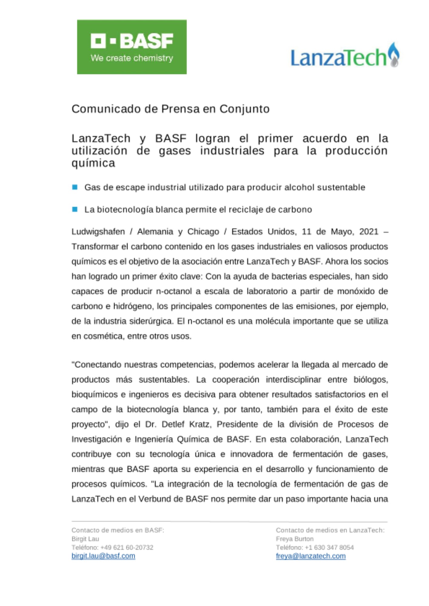 "Conectando nuestras competencias, podemos acelerar la llegada al mercado de productos más sustentables. La cooperación interdisciplinar entre biólogos, bioquímicos e ingenieros es decisiva para obtener resultados satisfactorios en el campo de la biotecnología blanca y, por tanto, también para el éxito de este proyecto", dijo el Dr. Detlef Kratz, Presidente de la división de Procesos de Investigación e Ingeniería Química de BASF. En esta colaboración, LanzaTech contribuye con su tecnología única e innovadora de fermentación de gases, mientras que BASF aporta su experiencia en el desarrollo y funcionamiento de procesos químicos. "La integración de la tecnología de fermentación de gas de LanzaTech en el Verbund de BASF nos permite dar un paso importante hacia una economía circular neutra en carbono", añadió Kratz. Jennifer Holmgren, consejera delegada de LanzaTech, subrayó: "Nuestro clima está cambiando, y el mundo está observando con ansiedad mientras desarrollamos tecnologías que se necesitan urgentemente para mantener la importante materia prima, el carbono, en el ciclo. BASF está liderando el replanteamiento de la cadena de suministro de productos químicos, adoptando un modelo circular de transformación del carbono residual en nuevos materiales y manteniendo los combustibles fósiles en el suelo".