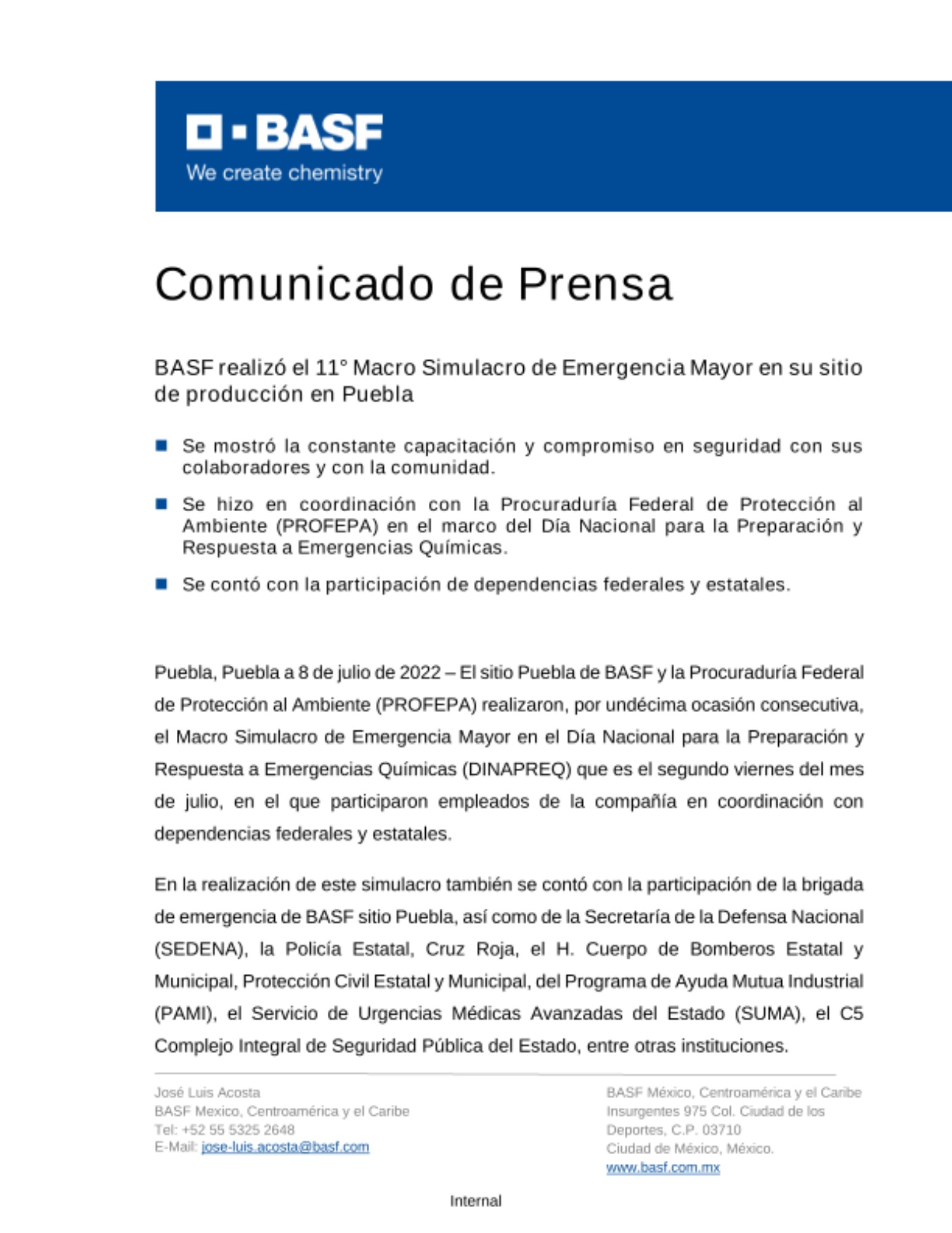Puebla, Puebla a 8 de julio de 2022 – El sitio Puebla de BASF y la Procuraduría Federal de Protección al Ambiente (PROFEPA) realizaron, por undécima ocasión consecutiva, el Macro Simulacro de Emergencia Mayor en el Día Nacional para la Preparación y Respuesta a Emergencias Químicas (DINAPREQ) que es el segundo viernes del mes de julio, en el que participaron empleados de la compañía en coordinación con dependencias federales y estatales.