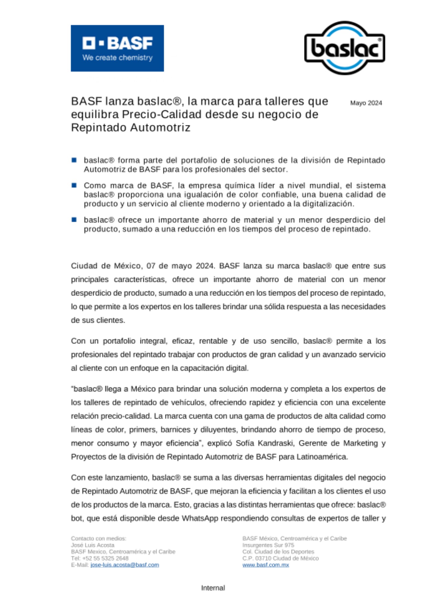 Ciudad de México, 07 de mayo 2024. BASF lanza su marca baslac® que entre sus principales características, ofrece un importante ahorro de material con un menor desperdicio de producto, sumado a una reducción en los tiempos del proceso de repintado, lo que permite a los expertos en los talleres brindar una sólida respuesta a las necesidades de sus clientes.