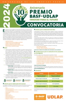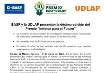 Cabe señalar que los interesados en participar en la décima edición del Premio BASF - UDLAP "Innovar para el Futuro" deben presentar un proyecto de investigación individual con un resumen de 5 cuartillas en PDF y un video de hasta dos minutos en MP4 al correo premio.basfudlap@udlap.mx. Para mayores detalles de la convocatoria, visite el sitio web oficial de la UDLAP o el de BASF.
