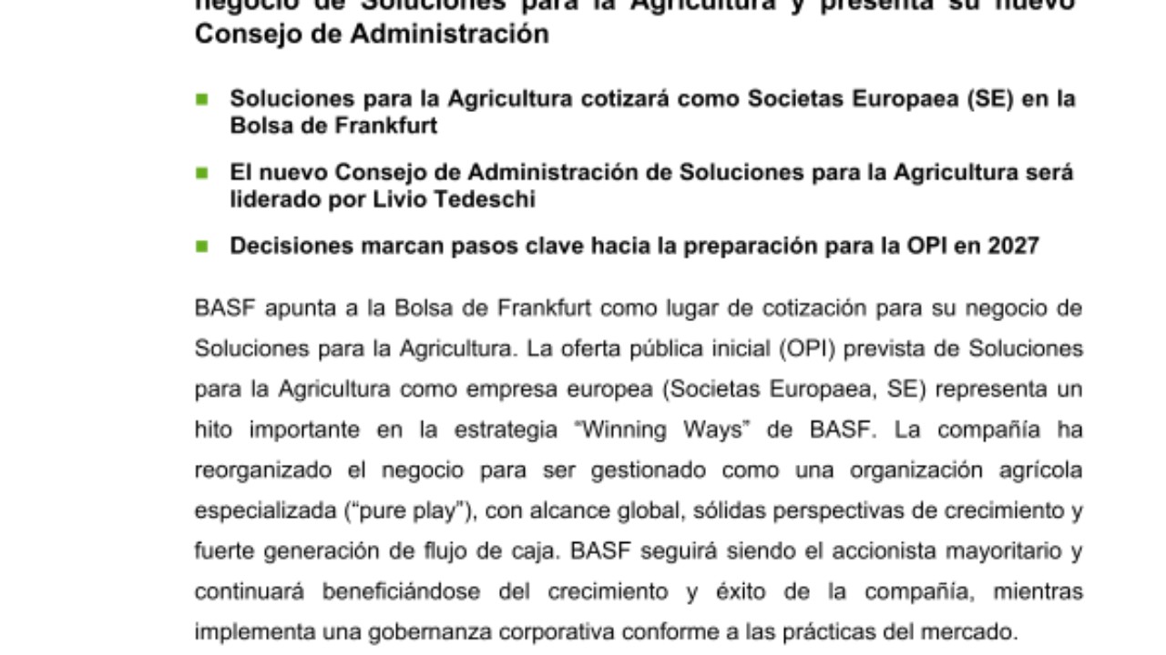 BASF apunta a la Bolsa de Frankfurt como lugar de cotización para su negocio de Soluciones para la Agricultura. La oferta pública inicial (OPI) prevista de Soluciones para la Agricultura como empresa europea (Societas Europaea, SE) representa un hito importante en la estrategia “Winning Ways” de BASF. La compañía ha reorganizado el negocio para ser gestionado como una organización agrícola especializada (“pure play”), con alcance global, sólidas perspectivas de crecimiento y fuerte generación de flujo de caja. BASF seguirá siendo el accionista mayoritario y continuará beneficiándose del crecimiento y éxito de la compañía, mientras implementa una gobernanza corporativa conforme a las prácticas del mercado.