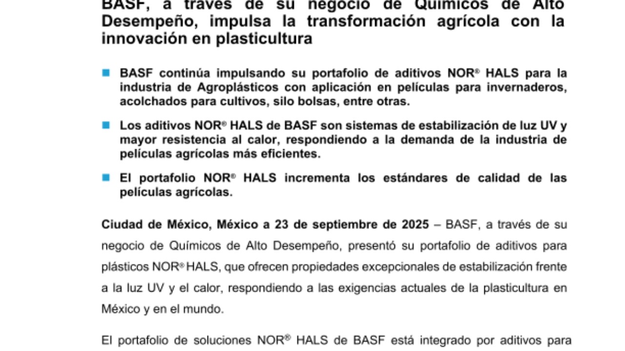 Ciudad de México, México a 23 de septiembre de 2025 – BASF, a través de su negocio de Químicos de Alto Desempeño, presentó su portafolio de aditivos para plásticos NOR® HALS, que ofrecen propiedades excepcionales de estabilización frente a la luz UV y el calor, respondiendo a las exigencias actuales de la plasticultura en México y en el mundo.