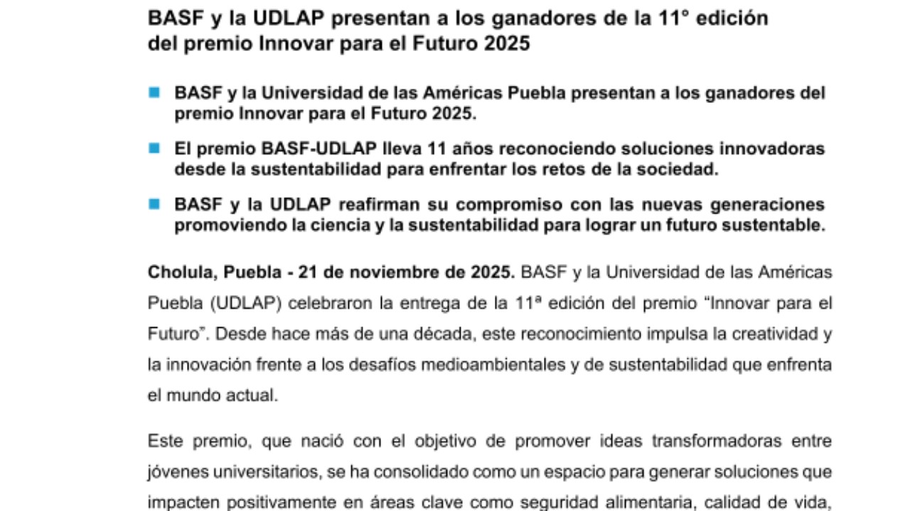 Cholula, Puebla - 21 de noviembre de 2025. BASF y la Universidad de las Américas Puebla (UDLAP) celebraron la entrega de la 11ª edición del premio “Innovar para el Futuro”. Desde hace más de una década, este reconocimiento impulsa la creatividad y la innovación frente a los desafíos medioambientales y de sustentabilidad que enfrenta el mundo actual.