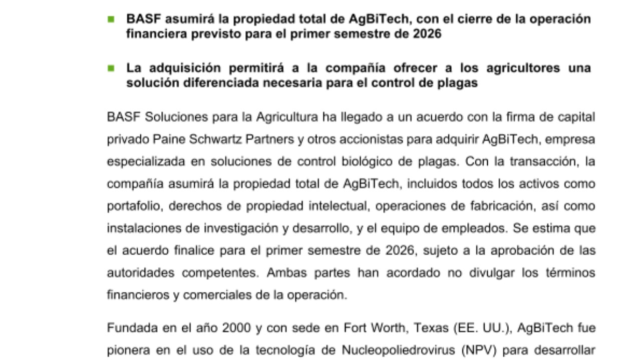 BASF Soluciones para la Agricultura ha llegado a un acuerdo con la firma de capital privado Paine Schwartz Partners y otros accionistas para adquirir AgBiTech, empresa especializada en soluciones de control biológico de plagas. Con la transacción, la compañía asumirá la propiedad total de AgBiTech, incluidos todos los activos como portafolio, derechos de propiedad intelectual, operaciones de fabricación, así como instalaciones de investigación y desarrollo, y el equipo de empleados. Se estima que el acuerdo finalice para el primer semestre de 2026, sujeto a la aprobación de las autoridades competentes. Ambas partes han acordado no divulgar los términos financieros y comerciales de la operación.