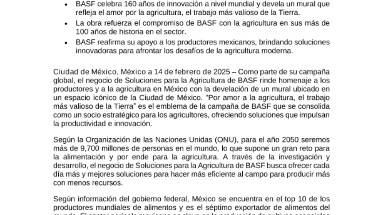 Ciudad de México, México a 14 de febrero de 2025 – Como parte de su campaña global, el negocio de Soluciones para la Agricultura de BASF rinde homenaje a los productores y a la agricultura en México con la develación de un mural ubicado en un espacio icónico de la Ciudad de México. “Por amor a la agricultura, el trabajo más valioso de la Tierra” es el emblema de la campaña de BASF que se consolida como un socio estratégico para los agricultores, ofreciendo soluciones que impulsan la productividad e innovación.