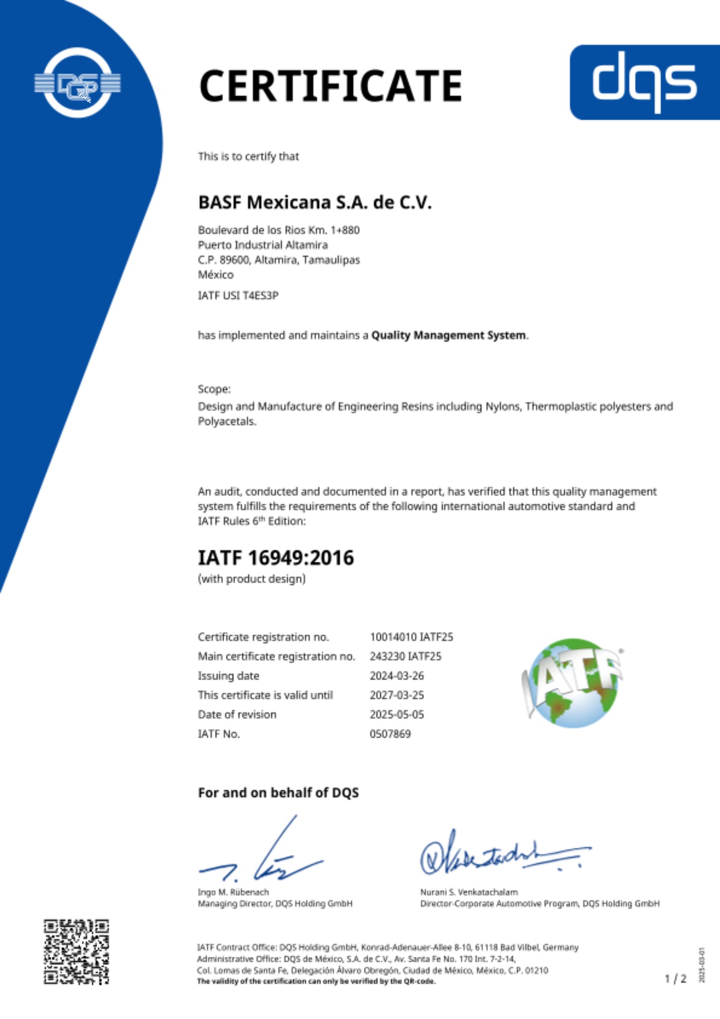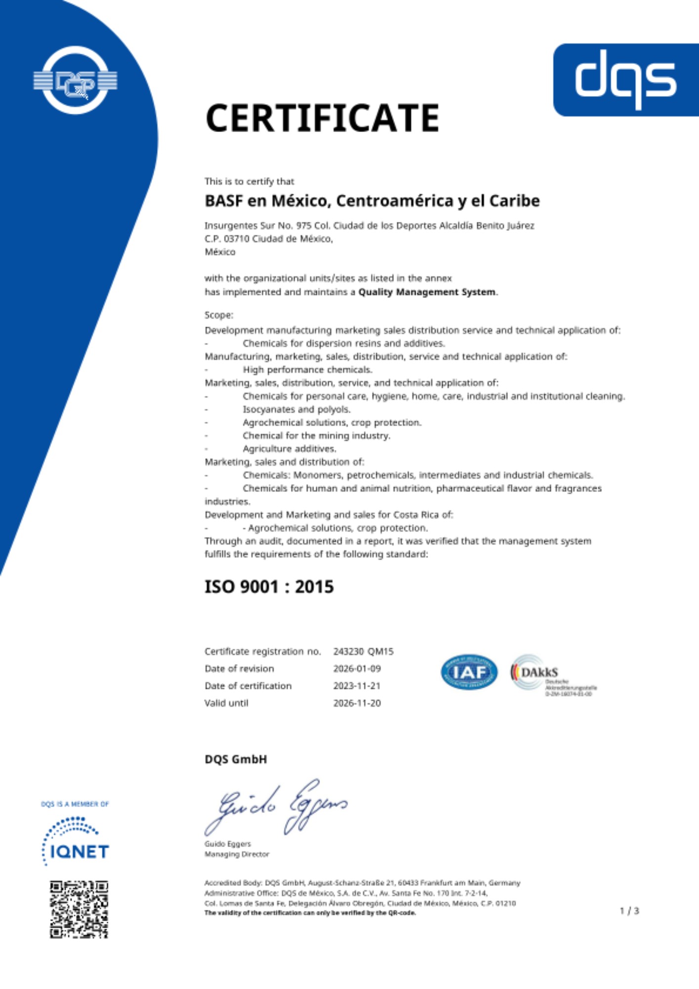 El Grupo BASF en México, Centroamérica y el Caribe cuenta con certificaciones en estándares internacionales que validan la consistencia de los procesos establecidos para dar respuesta a las necesidades de nuestros clientes.
