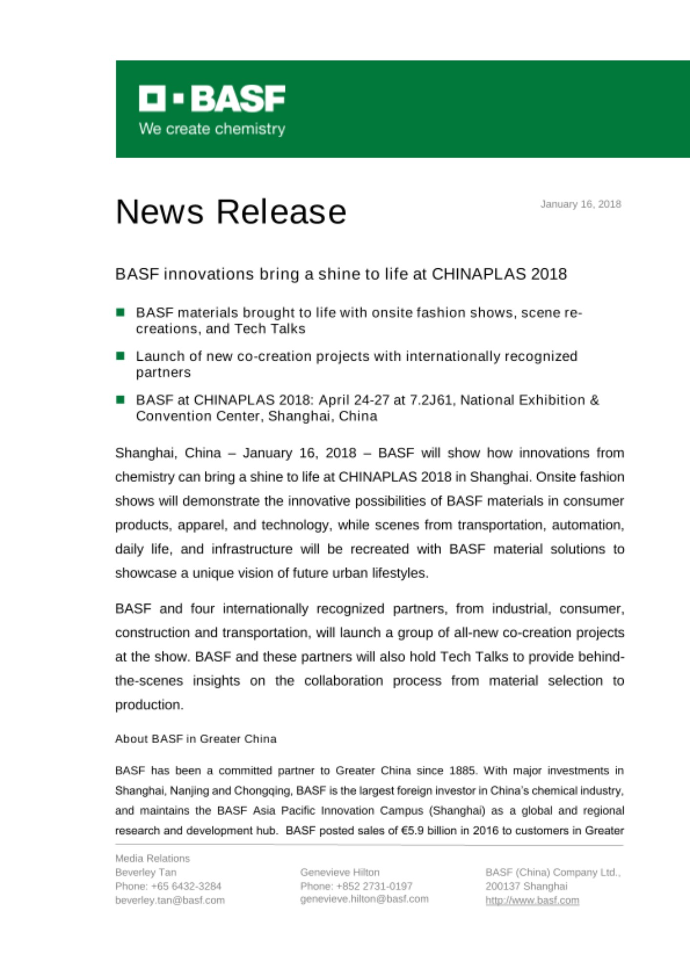 - BASF at CHINAPLAS 2018: April 24-27 at 7.2J61, National Exhibition & Convention Center, Shanghai, China