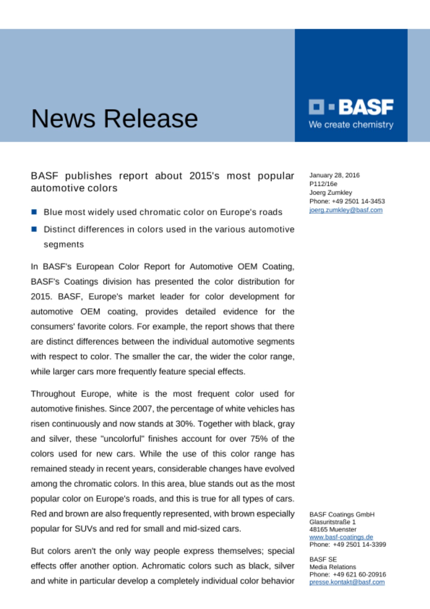 In BASF's European Color Report for Automotive OEM Coating, BASF's Coatings division has presented the color distribution for 2015. BASF, Europe's market leader for color development for automotive OEM coating, provides detailed evidence for the consumers' favorite colors. For example, the report shows that there are distinct differences between the individual automotive segments with respect to color. The smaller the car, the wider the color range, while larger cars more frequently feature special effects.