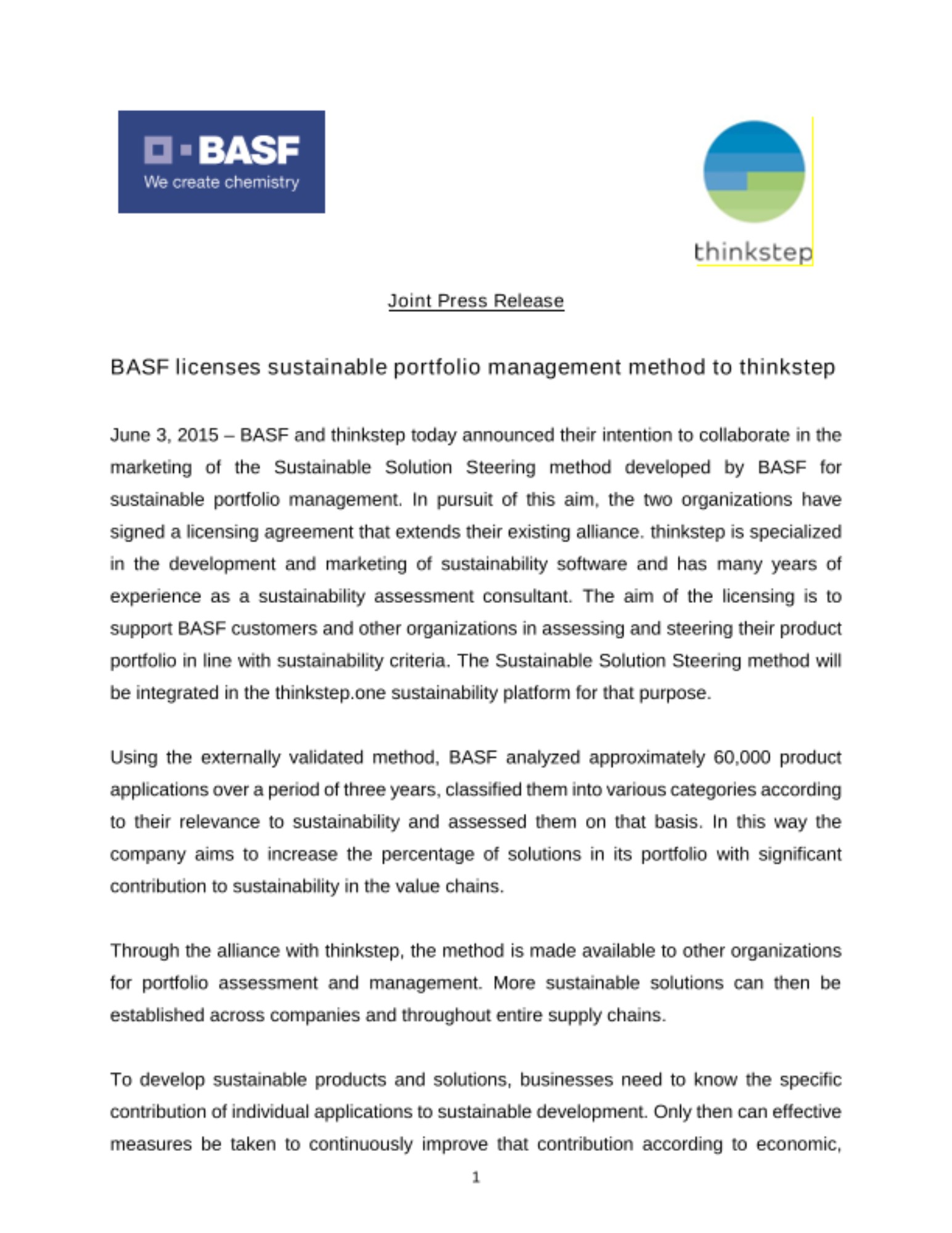 June 3, 2015 – BASF and thinkstep today announced their intention to collaborate in the marketing of the Sustainable Solution Steering method developed by BASF for sustainable portfolio management. In pursuit of this aim, the two organizations have signed a licensing agreement that extends their existing alliance. thinkstep is specialized in the development and marketing of sustainability software and has many years of experience as a sustainability assessment consultant. The aim of the licensing is to support BASF customers and other organizations in assessing and steering their product portfolio in line with sustainability criteria. The Sustainable Solution Steering method will be integrated in the thinkstep.one sustainability platform for that purpose.