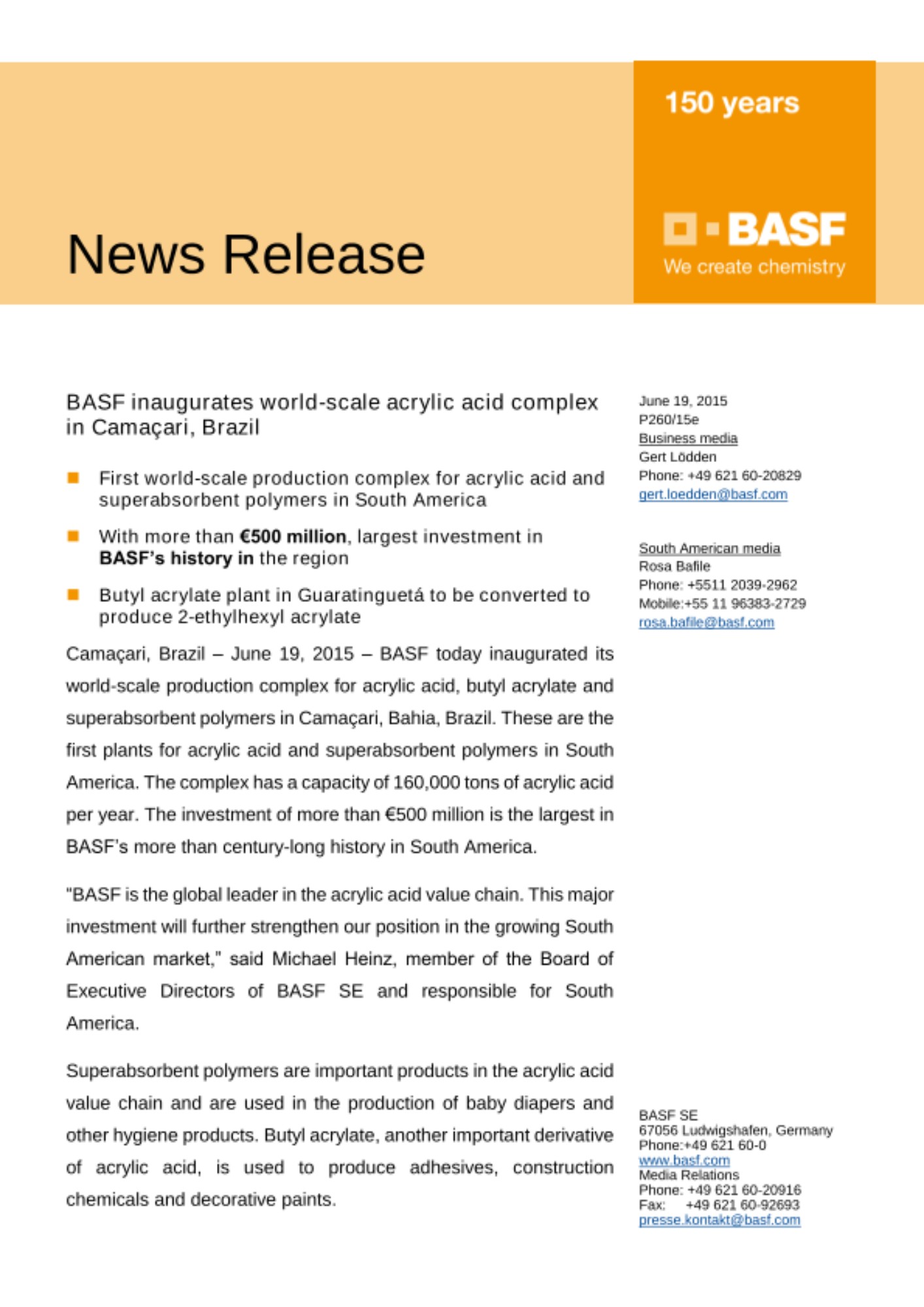 Camaçari, Brazil – June 19, 2015 – BASF today inaugurated its world-scale production complex for acrylic acid, butyl acrylate and superabsorbent polymers in Camaçari, Bahia, Brazil. These are the first plants for acrylic acid and superabsorbent polymers in South America. The complex has a capacity of 160,000 tons of acrylic acid per year. The investment of more than €500 million is the largest in BASF’s more than century-long history in South America.
