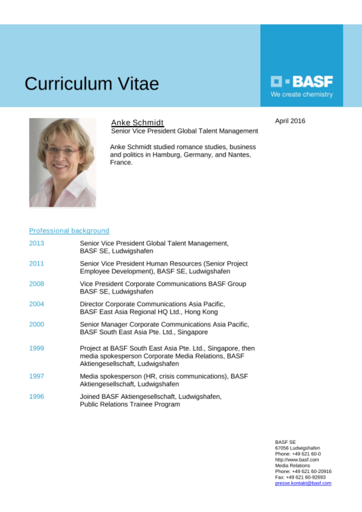 Effective July 1, 2016, Anke Schmidt (46), Senior Vice President Global Talent Management, will assume responsibility for the Communications & Government Relations department at BASF. She succeeds Elisabeth Schick (49) and will report to the chairman of the Board of Executive Directors in this function. Schick is leaving the company at her own request.