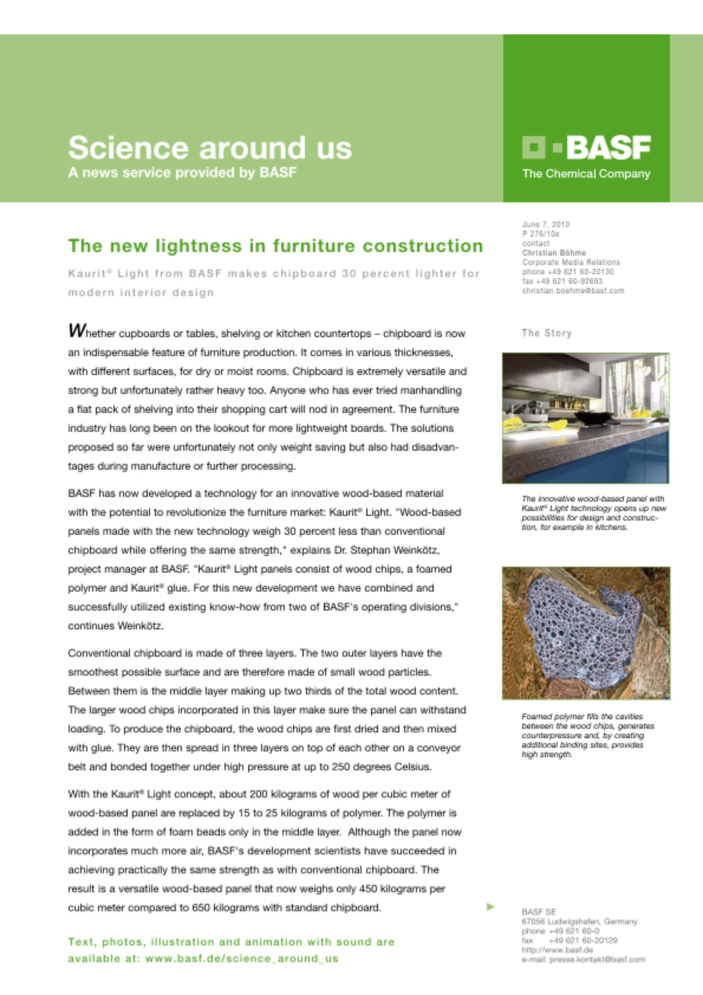 BASF has now developed a technology for an innovative wood-based material with the potential to revolutionize the furniture market: Kaurit® Light. "Wood-based panels made with the new technology weigh 30 percent less than conventional chipboard while offering the same strength," explains Dr. Stephan Weinkötz, project manager at BASF. "Kaurit® Light panels consist of wood chips, a foamed polymer and Kaurit® glue. For this new development we have combined and successfully utilized existing know-how from two of BASF's operating divisions," continues Weinkötz.