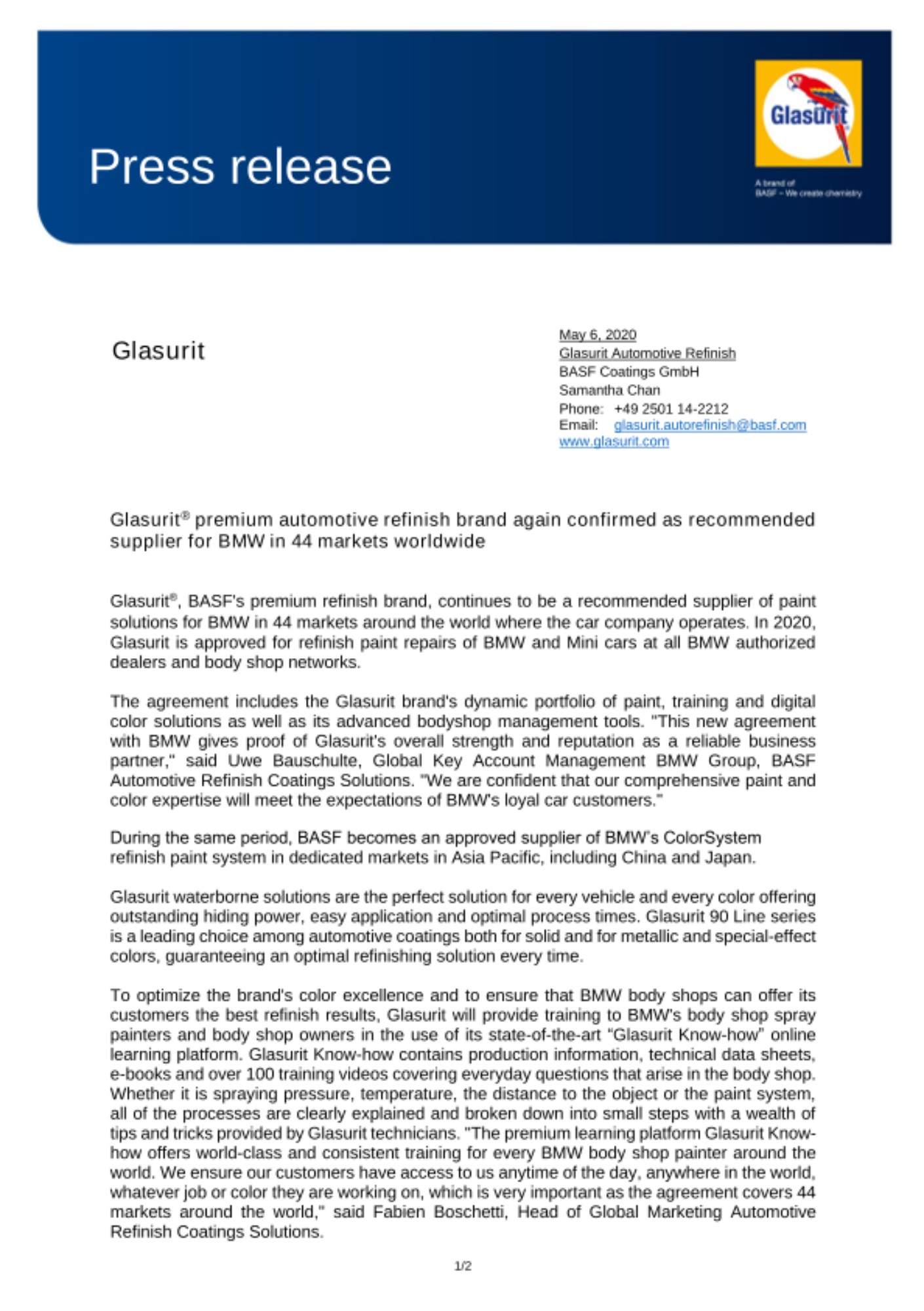 The agreement includes the Glasurit brand's dynamic portfolio of paint, training and digital color solutions as well as its advanced bodyshop management tools. "This new agreement with BMW gives proof of Glasurit's overall strength and reputation as a reliable business partner," said Uwe Bauschulte, Global Key Account Management BMW Group, BASF Automotive Refinish Coatings Solutions. "We are confident that our comprehensive paint and color expertise will meet the expectations of BMW's loyal car customers."