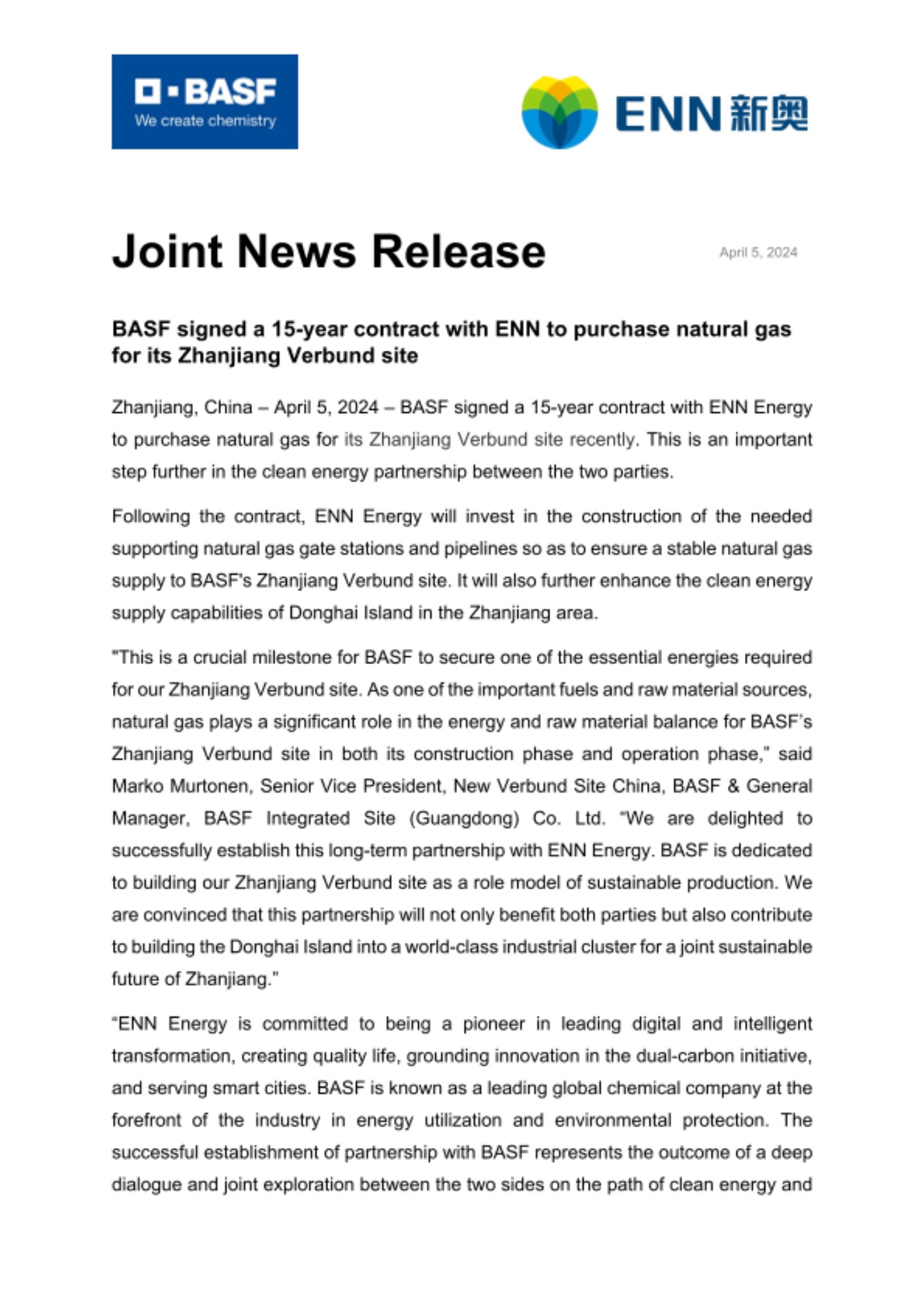 "This is a crucial milestone for BASF to secure one of the essential energies required for our Zhanjiang Verbund site. As one of the important fuels and raw material sources, natural gas plays a significant role in the energy and raw material balance for BASF’s Zhanjiang Verbund site in both its construction phase and operation phase,” said Marko Murtonen, Senior Vice President, New Verbund Site China, BASF & General Manager, BASF Integrated Site (Guangdong) Co. Ltd. “We are delighted to successfully establish this long-term partnership with ENN Energy. BASF is dedicated to building our Zhanjiang Verbund site as a role model of sustainable production. We are convinced that this partnership will not only benefit both parties but also contribute to building the Donghai Island into a world-class industrial cluster for a joint sustainable future of Zhanjiang.”