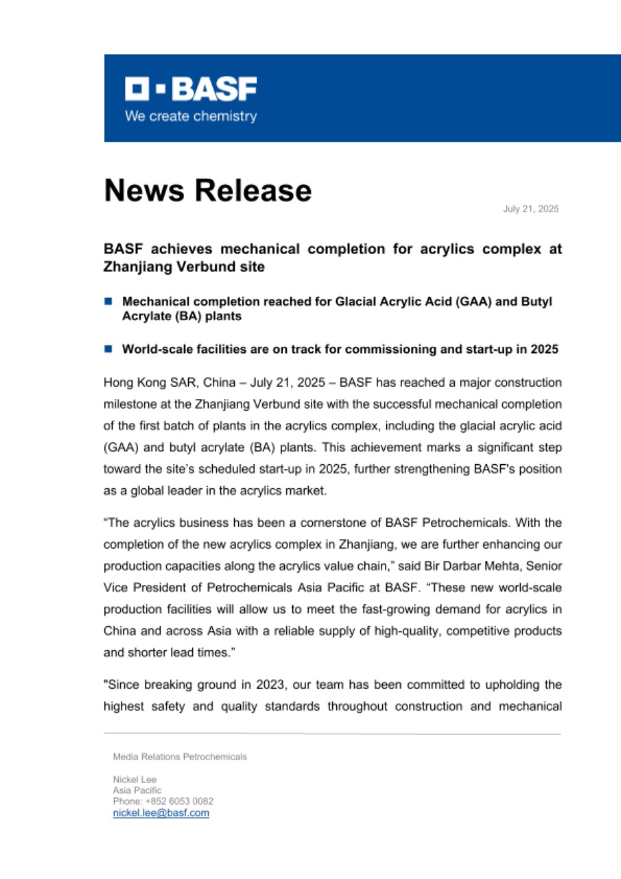 Hong Kong SAR, China – July 21, 2025 – BASF has reached a major construction milestone at the Zhanjiang Verbund site with the successful mechanical completion of the first batch of plants in the acrylics complex, including the glacial acrylic acid (GAA) and butyl acrylate (BA) plants. This achievement marks a significant step toward the site’s scheduled start-up in 2025, further strengthening BASF's position as a global leader in the acrylics market.