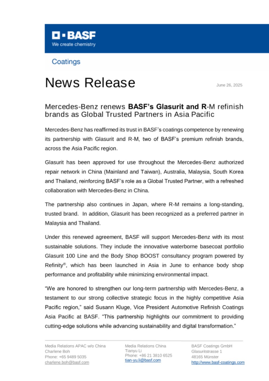 This renewal underscores BASF’s dedication to innovation and excellence, ensuring exceptional service for Mercedes-Benz customers across the Asia Pacific region. In addition to the contracted markets, BASF continues to service Mercedes-Benz and their certified shops in Hong Kong SAR, Indonesia, Mongolia, and Singapore.