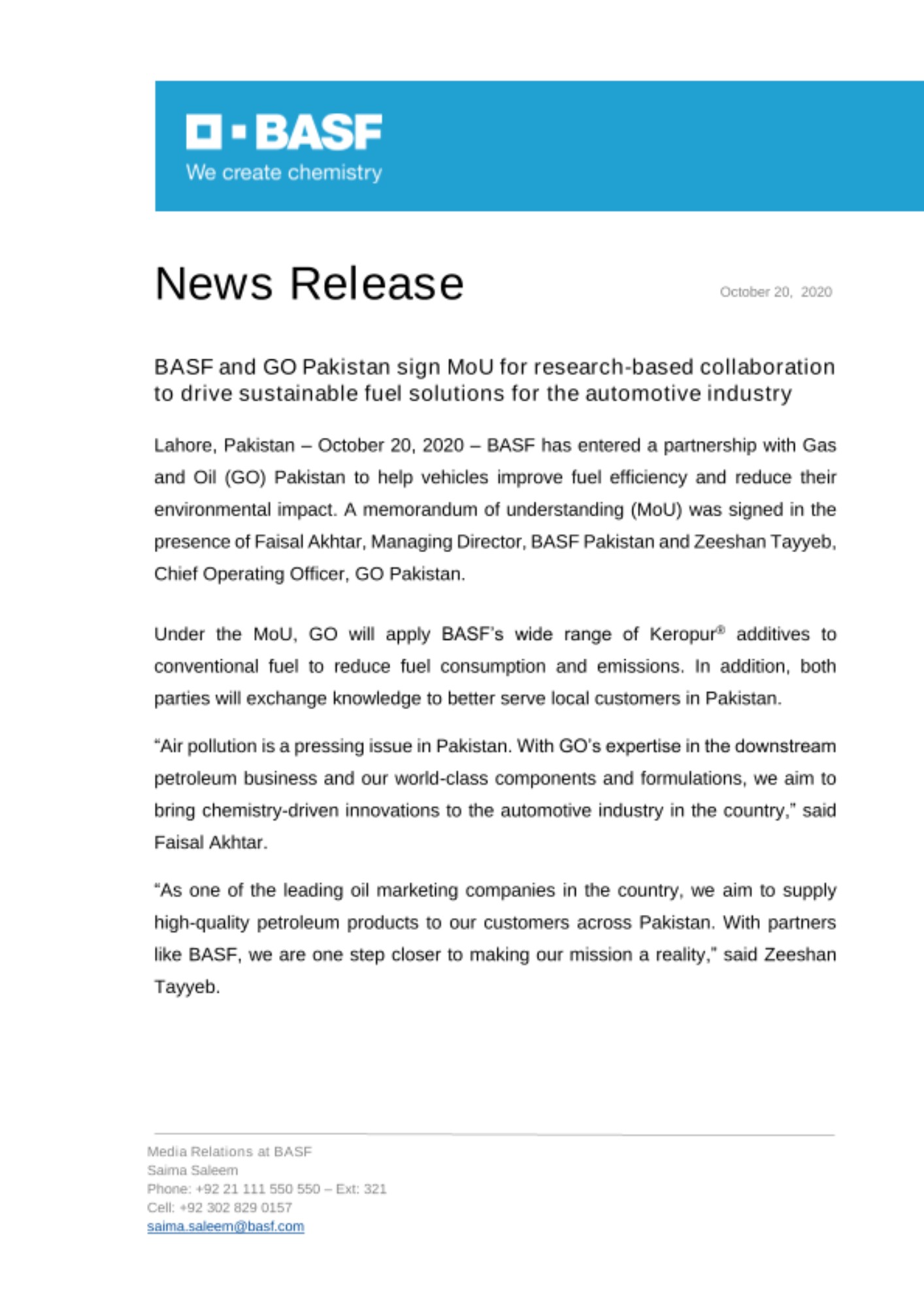 Lahore, Pakistan – October 20, 2020 – BASF has entered a partnership with Gas and Oil (GO) Pakistan to help vehicles improve fuel efficiency and reduce their environmental impact. A memorandum of understanding (MoU) was signed in the presence of Faisal Akhtar, Managing Director, BASF Pakistan and Zeeshan Tayyeb, Chief Operating Officer, GO Pakistan.
