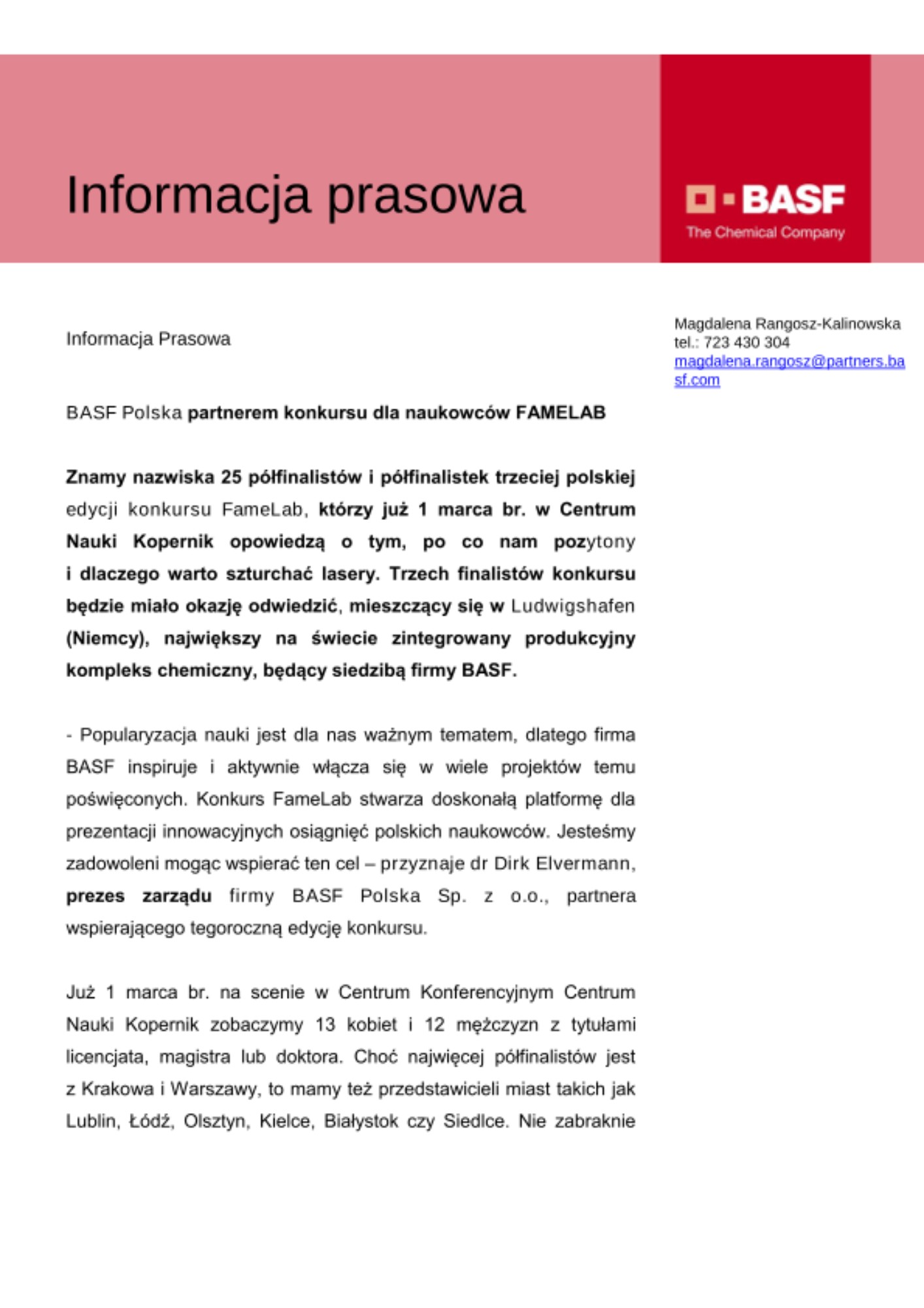 - Popularyzacja nauki jest dla nas ważnym tematem, dlatego firma BASF inspiruje i aktywnie włącza się w wiele projektów temu poświęconych. Konkurs FameLab stwarza doskonałą platformę dla prezentacji innowacyjnych osiągnięć polskich naukowców. Jesteśmy zadowoleni mogąc wspierać ten cel – przyznaje dr Dirk Elvermann, prezes zarządu firmy BASF Polska Sp. z o.o., partnera wspierającego tegoroczną edycję konkursu.