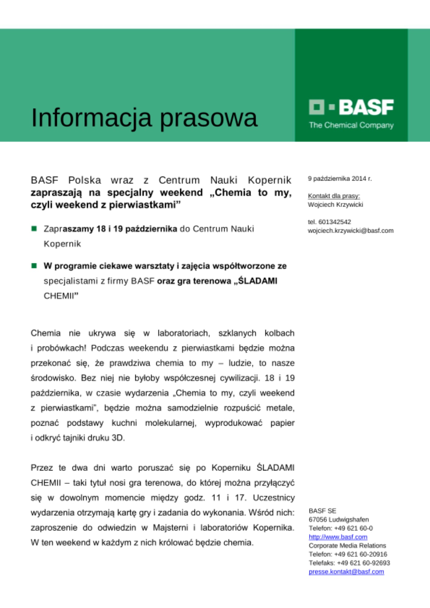 BASF Polska współpracuje z Centrum Nauki Kopernik od 2010 roku jako partner licznych wydarzeń i projektów promujących naukę oraz jako wyłączny partner laboratorium chemicznego, które rocznie odwiedza 10 000 dzieci i młodzieży.