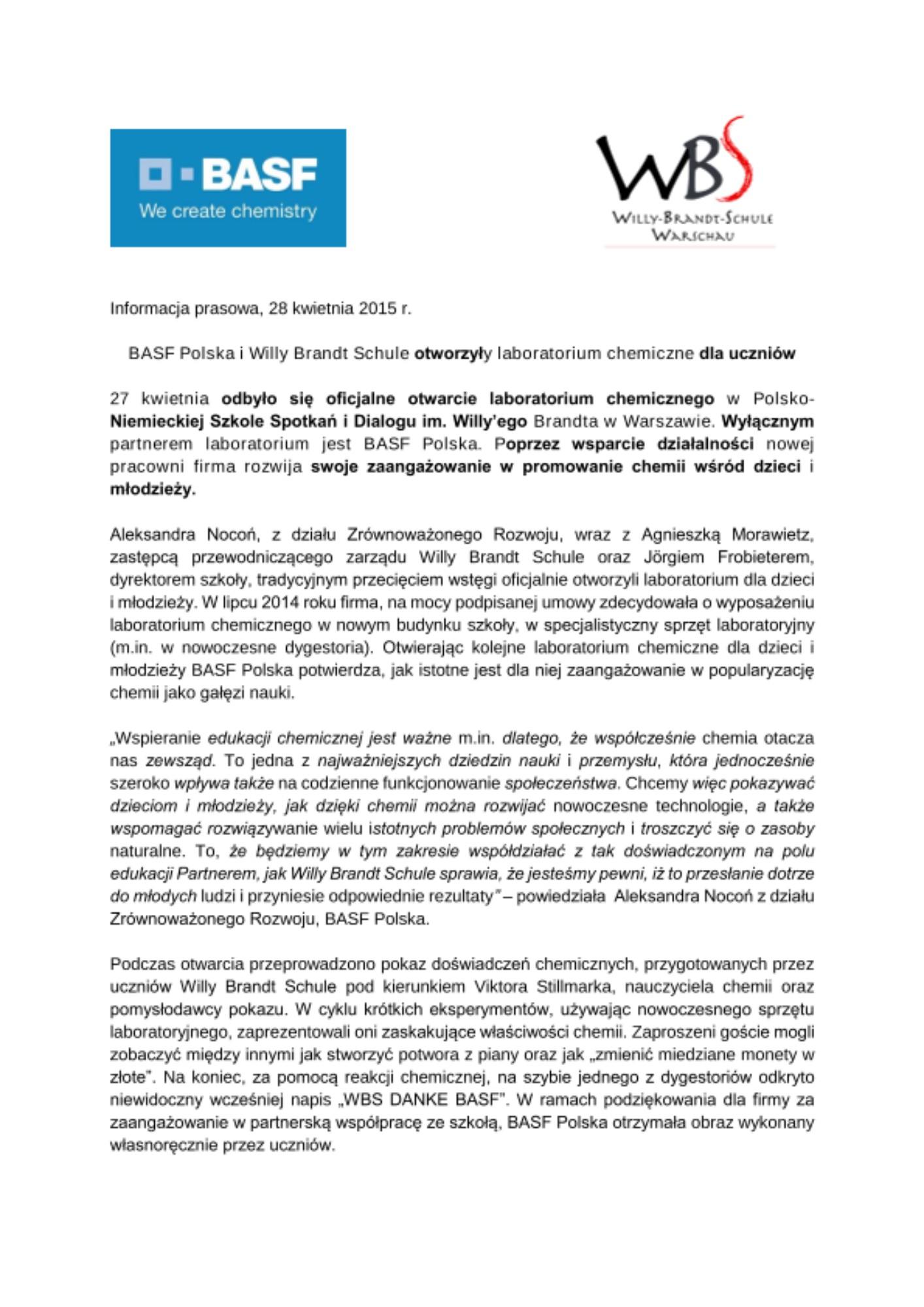 Aleksandra Nocoń, z działu Zrównoważonego Rozwoju, wraz z Agnieszką Morawietz, zastępcą przewodniczącego zarządu Willy Brandt Schule oraz Jörgiem Frobieterem, dyrektorem szkoły, tradycyjnym przecięciem wstęgi oficjalnie otworzyli laboratorium dla dzieci i młodzieży. W lipcu 2014 roku firma, na mocy podpisanej umowy zdecydowała o wyposażeniu laboratorium chemicznego w nowym budynku szkoły, w specjalistyczny sprzęt laboratoryjny (m.in. w nowoczesne dygestoria). Otwierając kolejne laboratorium chemiczne dla dzieci i młodzieży BASF Polska potwierdza, jak istotne jest dla niej zaangażowanie w popularyzację chemii jako gałęzi nauki.