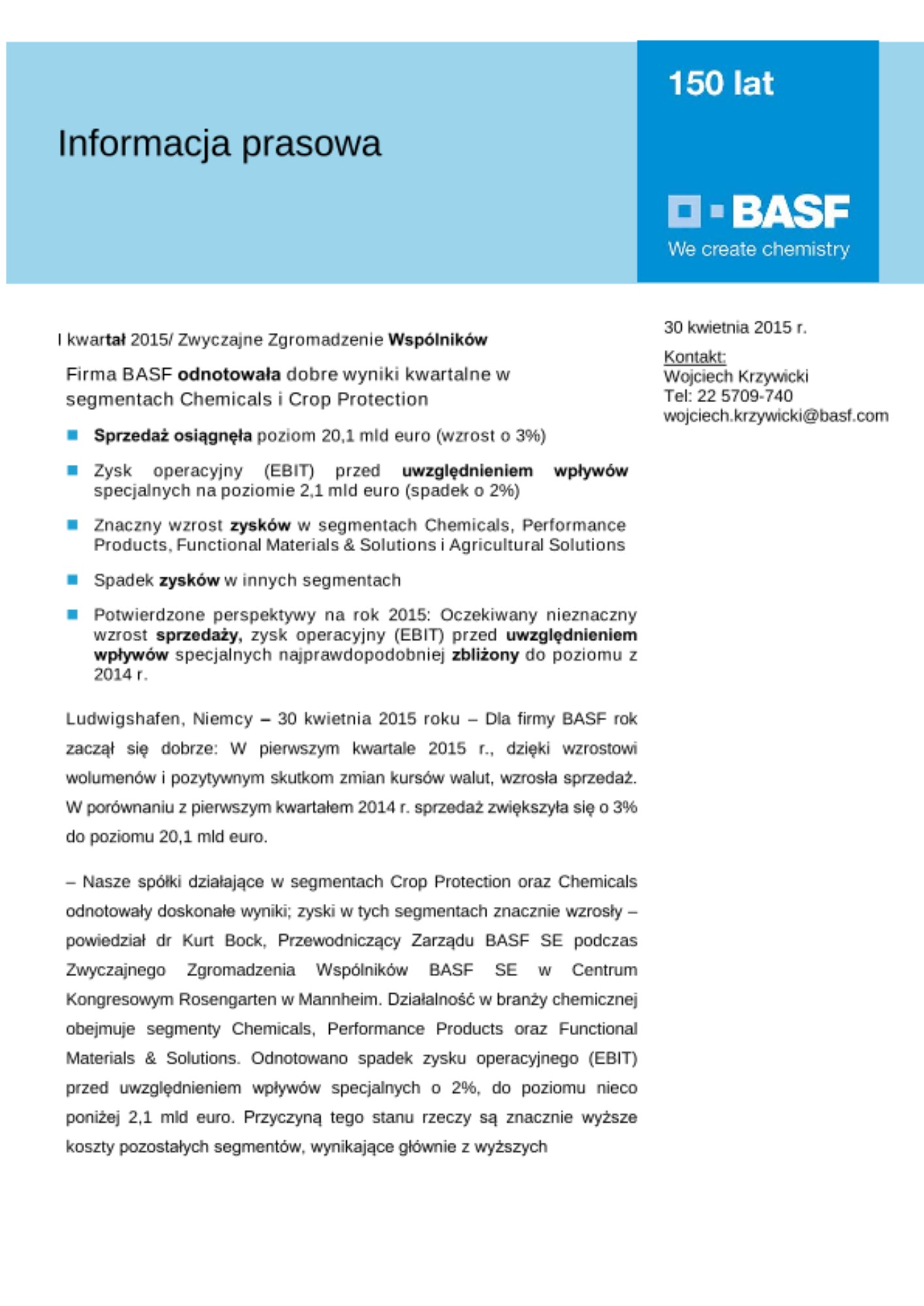 W porównaniu z pierwszym kwartałem 2014 r. zysk operacyjny (EBIT) zmalał o 226 mln euro, do kwoty 2,0 mld euro. W pierwszym kwartale ub. roku uwzględniony został specjalny dochód wolny od opodatkowania ze zbycia akcji w polach naftowo-gazowych w części Morza Północnego należącej do Wielkiej Brytanii, które nie są eksploatowane przez BASF. Wynik finansowy wyniósł minus 164 mln euro, przekraczając poziom osiągnięty w pierwszym kwartale roku 2014 (minus 183 mln euro).