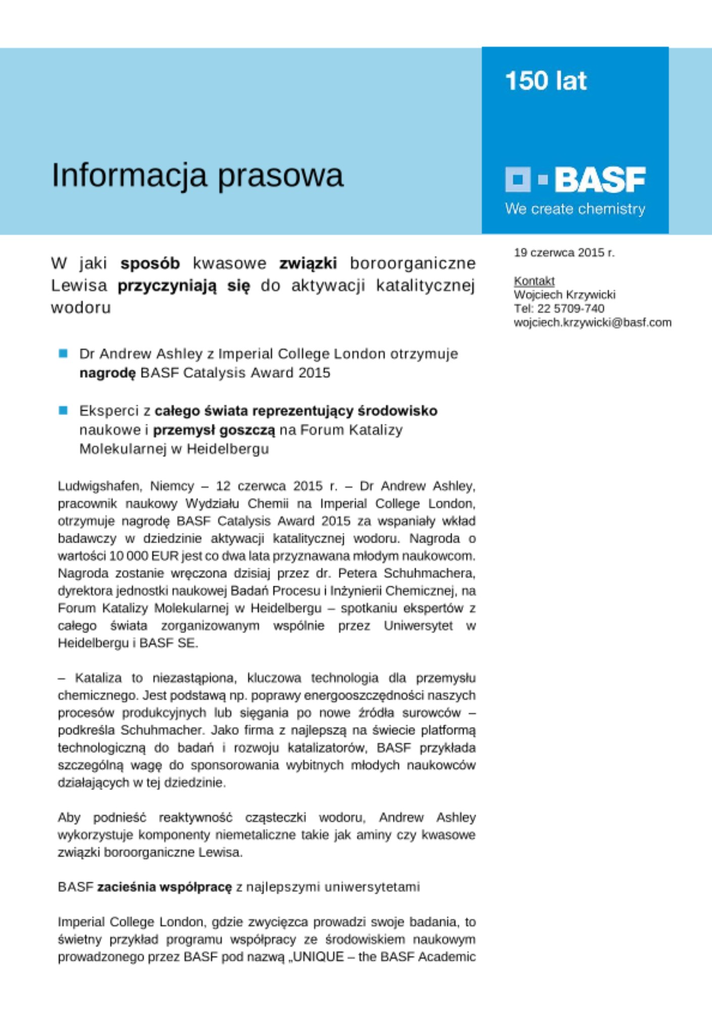 Ludwigshafen, Niemcy – 12 czerwca 2015 r. – Dr Andrew Ashley, pracownik naukowy Wydziału Chemii na Imperial College London, otrzymuje nagrodę BASF Catalysis Award 2015 za wspaniały wkład badawczy w dziedzinie aktywacji katalitycznej wodoru. Nagroda o wartości 10 000 EUR jest co dwa lata przyznawana młodym naukowcom. Nagroda zostanie wręczona dzisiaj przez dr. Petera Schuhmachera, dyrektora jednostki naukowej Badań Procesu i Inżynierii Chemicznej, na Forum Katalizy Molekularnej w Heidelbergu – spotkaniu ekspertów z całego świata zorganizowanym wspólnie przez Uniwersytet w Heidelbergu i BASF SE.