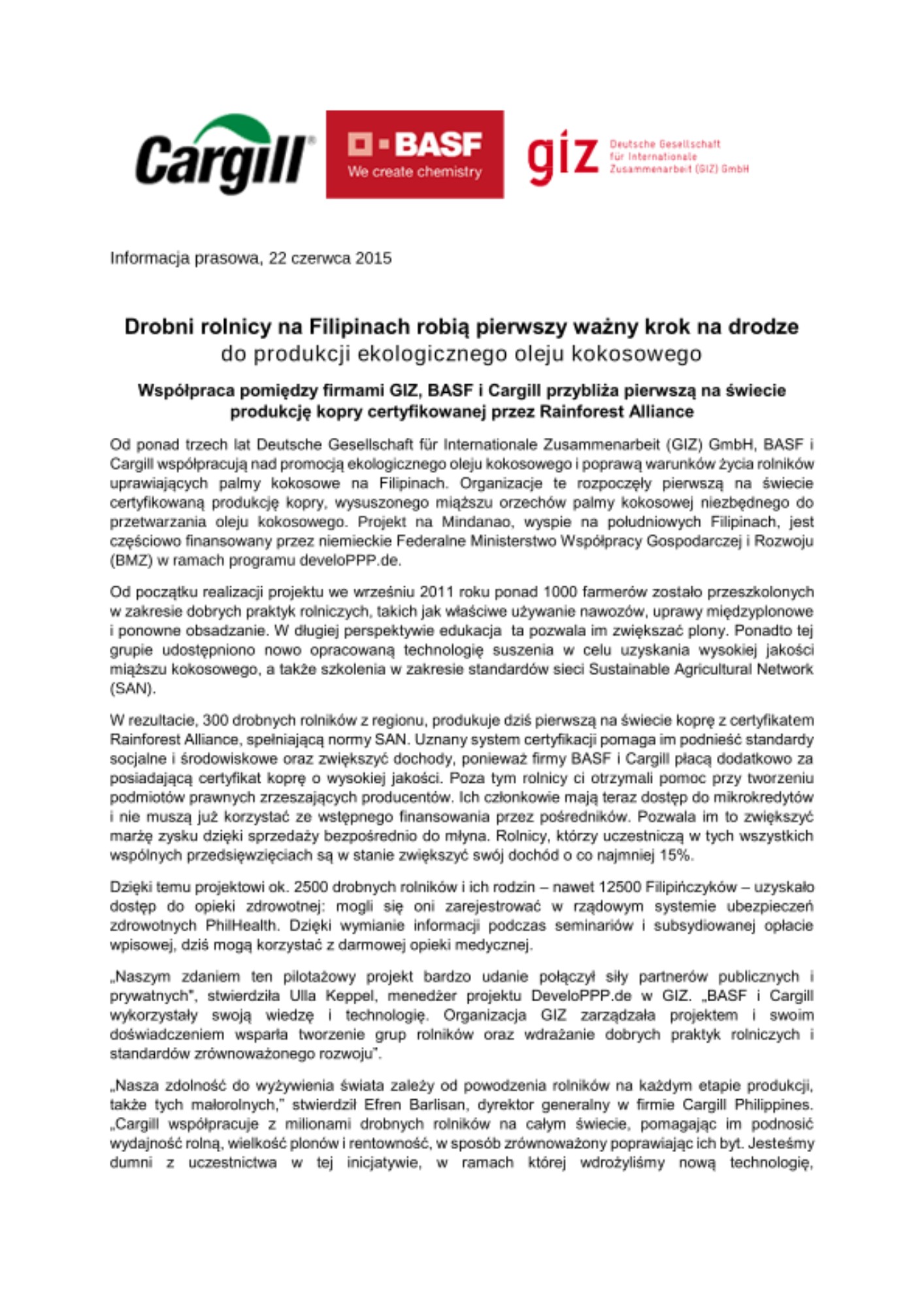 Od ponad trzech lat Deutsche Gesellschaft für Internationale Zusammenarbeit (GIZ) GmbH, BASF i Cargill współpracują nad promocją ekologicznego oleju kokosowego i poprawą warunków życia rolników uprawiających palmy kokosowe na Filipinach. Organizacje te rozpoczęły pierwszą na świecie certyfikowaną produkcję kopry, wysuszonego miąższu orzechów palmy kokosowej niezbędnego do przetwarzania oleju kokosowego. Projekt na Mindanao, wyspie na południowych Filipinach, jest częściowo finansowany przez niemieckie Federalne Ministerstwo Współpracy Gospodarczej i Rozwoju (BMZ) w ramach programu develoPPP.de.