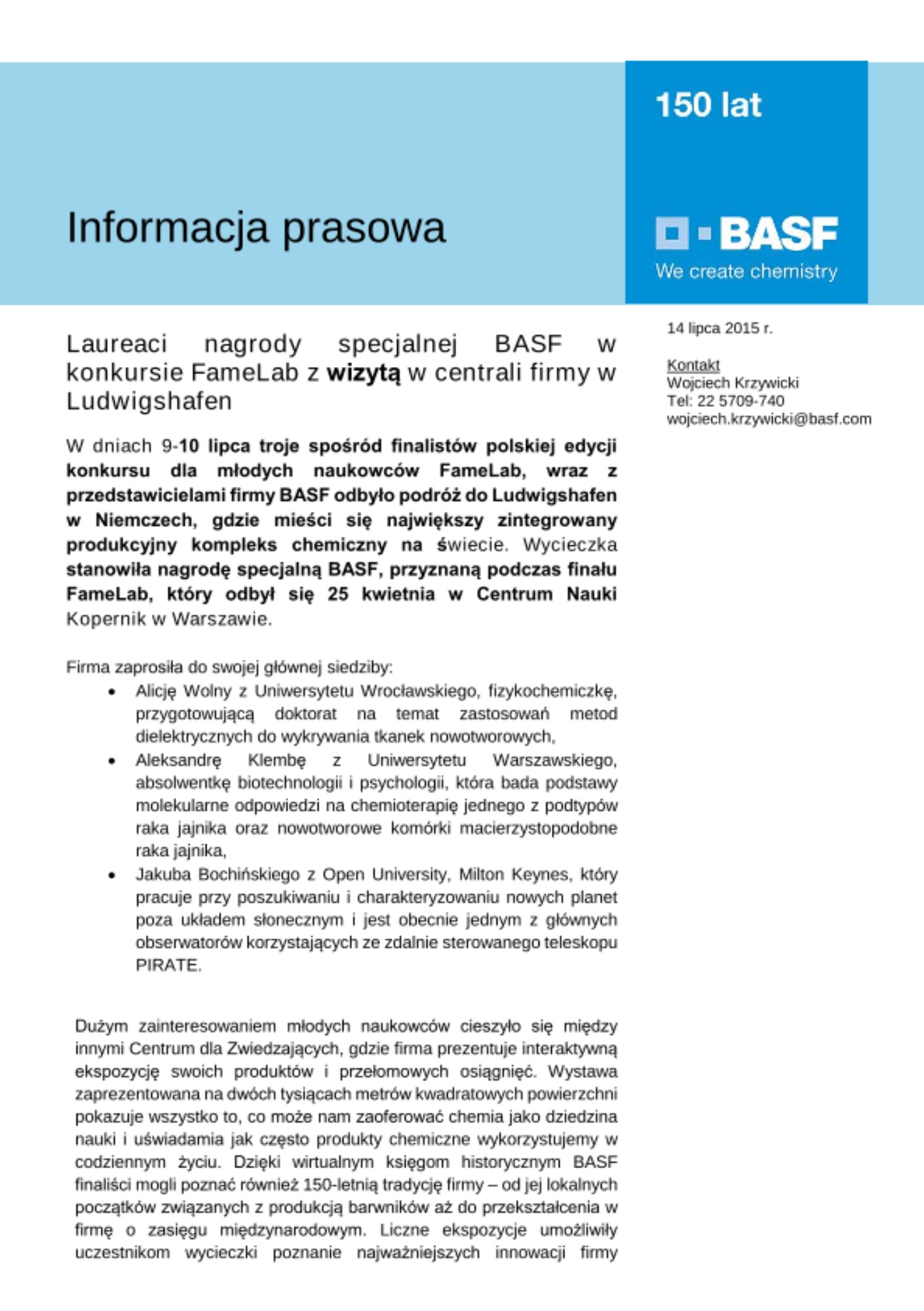 Wspólne zwiedzanie głównej siedziby BASF przez finalistów FameLabu i pracowników firmy staje się powoli tradycją. BASF Polska była Partnerem FameLabu już po raz drugi. Konkurs zachęca naukowców - naturalnych rzeczników nauki – do zabrania głosu publicznie. Podczas finału, który odbył się 25 kwietnia w Centrum Nauki Kopernik uczestnicy przedstawili efekty swojej pracy badawczej w ciągu trzyminutowych wystąpień. W ich ocenie brano pod uwagę przede wszystkim zawartość merytoryczną, jasność przekazu oraz charyzmę naukowców. Organizatorami FameLabu w Polsce są British Council i Centrum Nauki Kopernik. BASF Polska w swojej działalności szeroko angażuje się w popularyzowanie chemii jako dziedziny nauki. Udział firmy w konkursie stanowi przykład zaangażowania w stałą współpracę z Centrum Nauki Kopernik, w którym od 2010 roku działa laboratorium chemiczne dla dzieci i młodzieży, którego BASF jest wyłącznym partnerem.