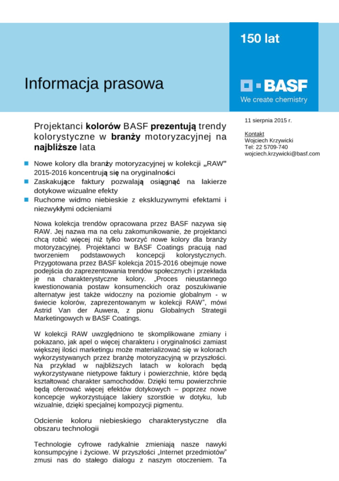 Nowa kolekcja trendów opracowana przez BASF nazywa się RAW. Jej nazwa ma na celu zakomunikowanie, że projektanci chcą robić więcej niż tylko tworzyć nowe kolory dla branży motoryzacyjnej. Projektanci w BASF Coatings pracują nad tworzeniem podstawowych koncepcji kolorystycznych. Przygotowana przez BASF kolekcja 2015-2016 obejmuje nowe podejścia do zaprezentowania trendów społecznych i przekłada je na charakterystyczne kolory. „Proces nieustannego kwestionowania postaw konsumenckich oraz poszukiwanie alternatyw jest także widoczny na poziomie globalnym - w świecie kolorów, zaprezentowanym w kolekcji RAW”, mówi Astrid Van der Auwera, z pionu Globalnych Strategii Marketingowych w BASF Coatings.