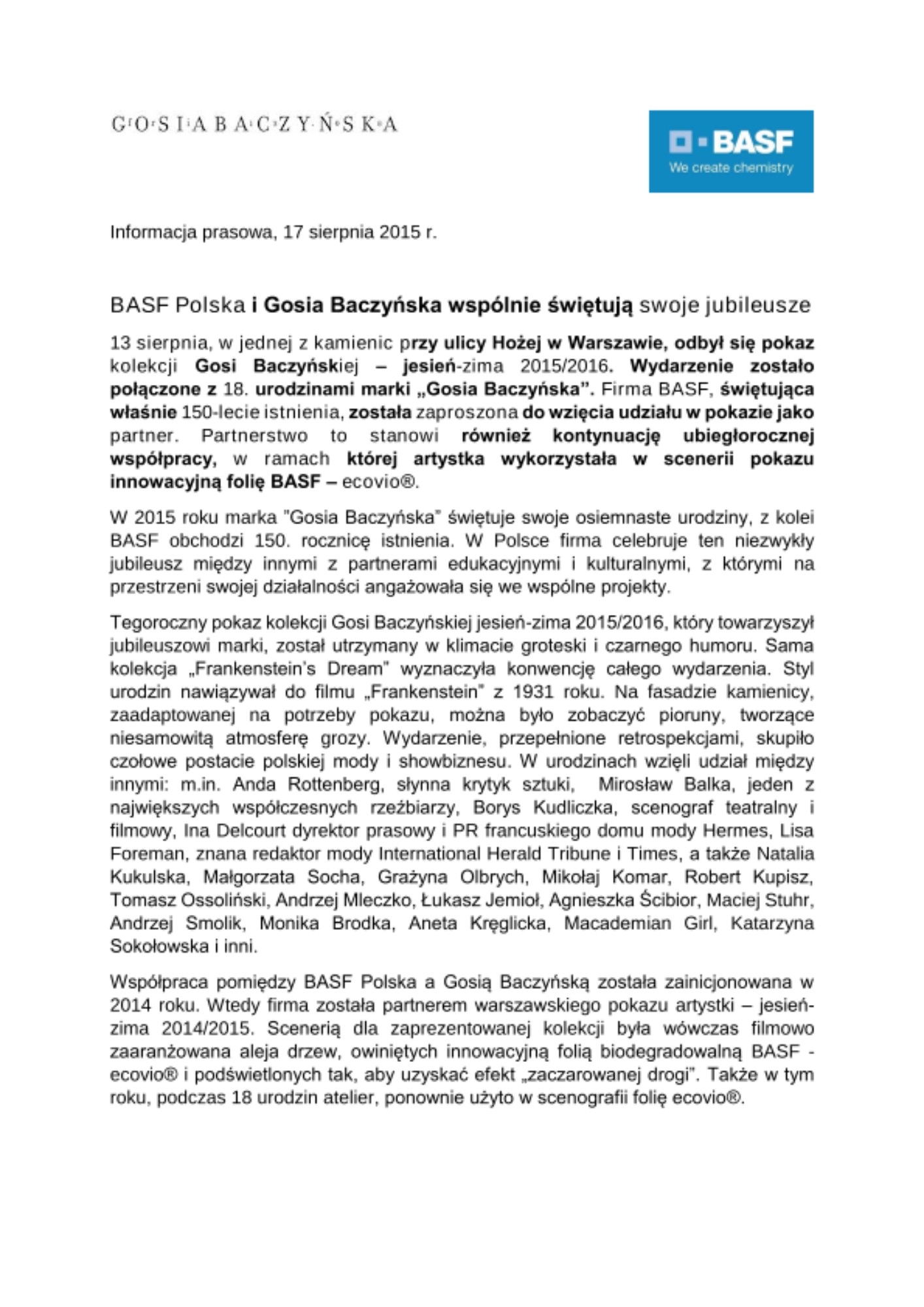 W 2015 roku marka ”Gosia Baczyńska” świętuje swoje osiemnaste urodziny, z kolei BASF obchodzi 150. rocznicę istnienia. W Polsce firma celebruje ten niezwykły jubileusz między innymi z partnerami edukacyjnymi i kulturalnymi, z którymi na przestrzeni swojej działalności angażowała się we wspólne projekty.