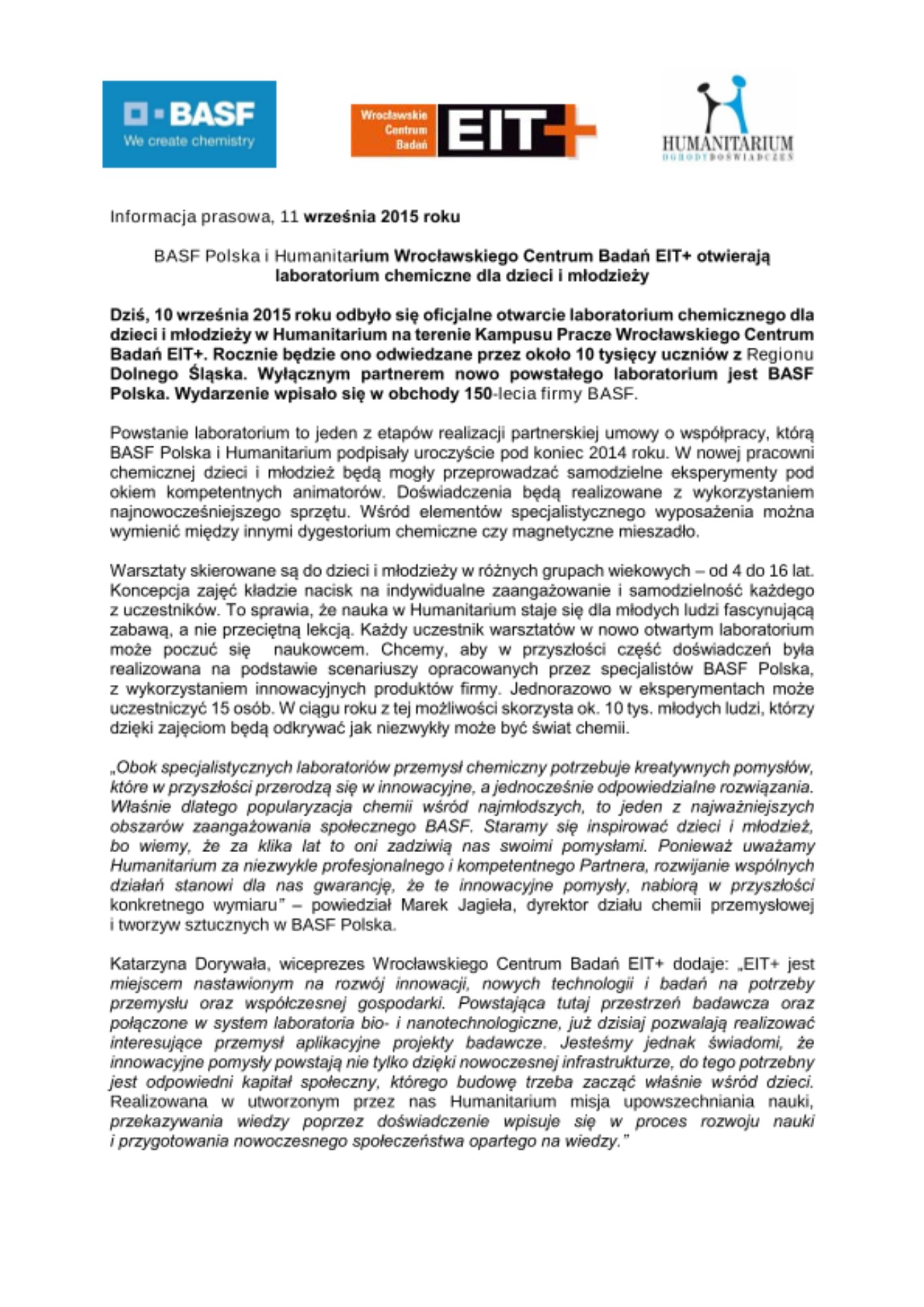10 września 2015 roku odbyło się oficjalne otwarcie laboratorium chemicznego dla dzieci i młodzieży w Humanitarium na terenie Kampusu Pracze Wrocławskiego Centrum Badań EIT+. Rocznie będzie ono odwiedzane przez około 10 tysięcy uczniów z Regionu Dolnego Śląska. Wyłącznym partnerem nowo powstałego laboratorium jest BASF Polska. Wydarzenie wpisało się w obchody 150-lecia firmy BASF.
