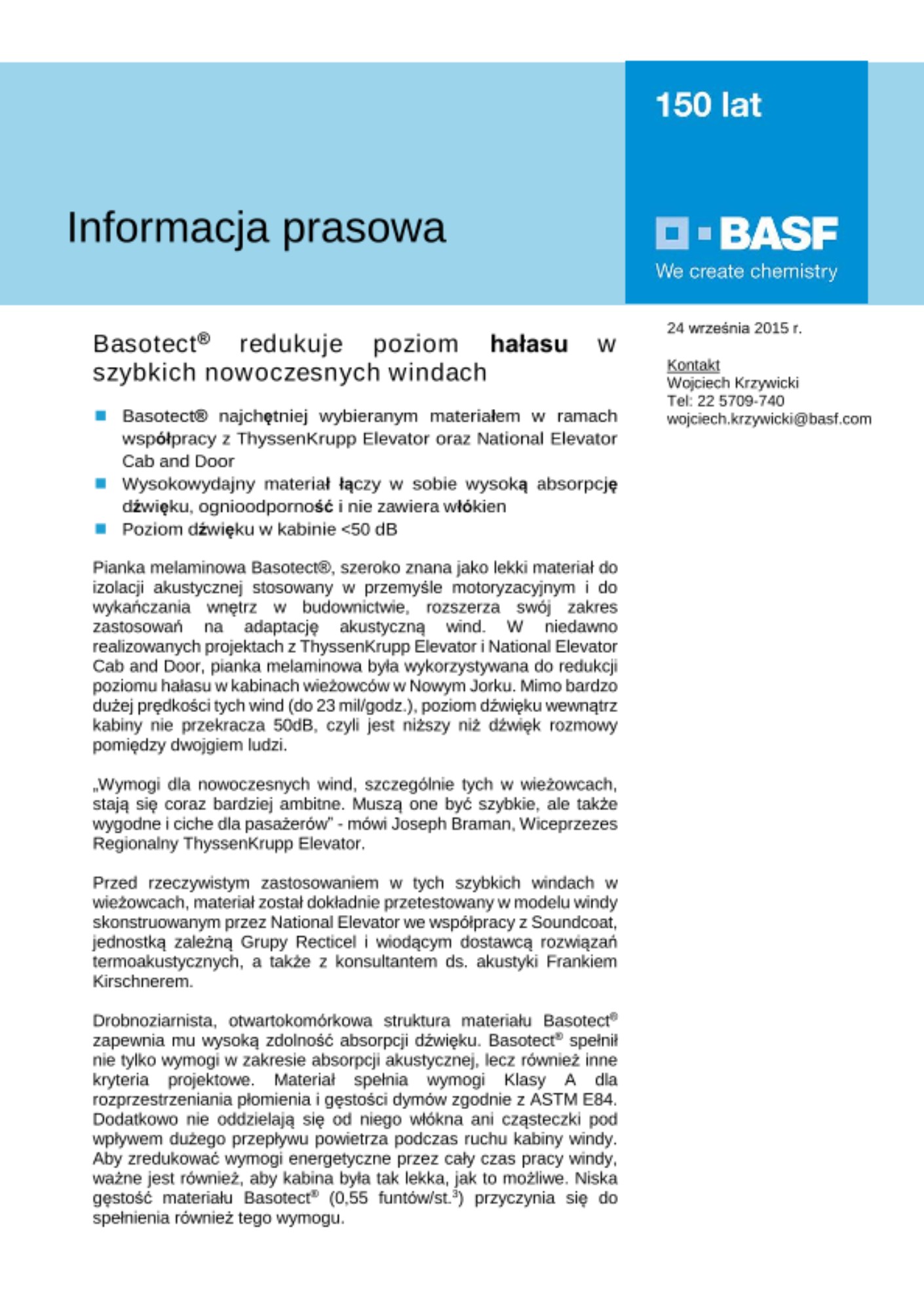 - Basotect® najchętniej wybieranym materiałem w ramach współpracy z ThyssenKrupp Elevator oraz National Elevator Cab and Door