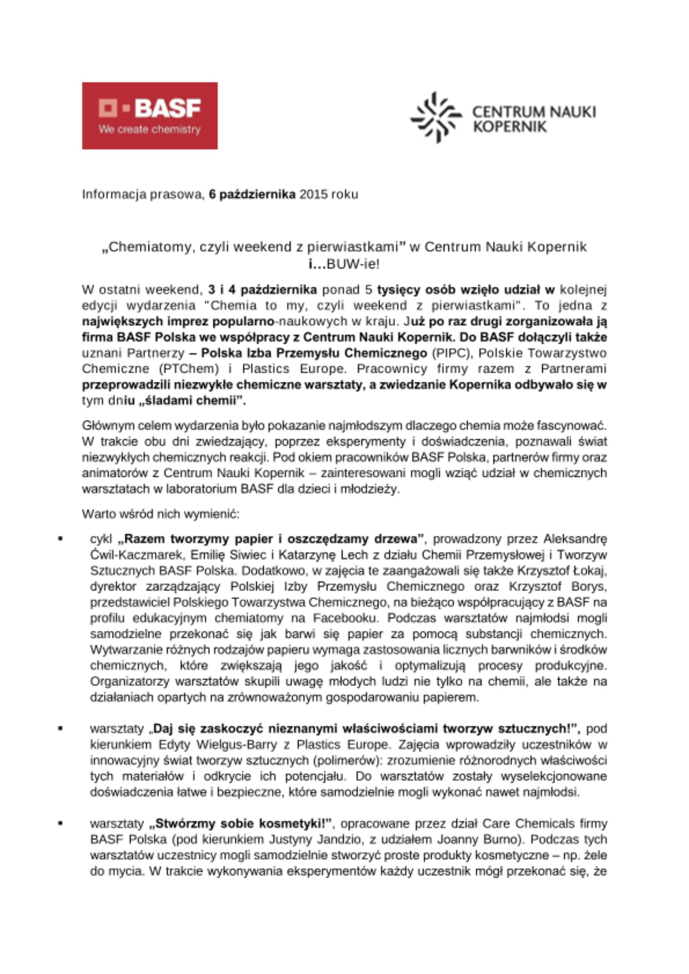 W ostatni weekend, 3 i 4 października ponad 5 tysięcy osób wzięło udział w kolejnej edycji wydarzenia "Chemia to my, czyli weekend z pierwiastkami". To jedna z największych imprez popularno-naukowych w kraju. Już po raz drugi zorganizowała ją firma BASF Polska we współpracy z Centrum Nauki Kopernik. Do BASF dołączyli także uznani Partnerzy – Polska Izba Przemysłu Chemicznego (PIPC), Polskie Towarzystwo Chemiczne (PTChem) i Plastics Europe. Pracownicy firmy razem z Partnerami przeprowadzili niezwykłe chemiczne warsztaty, a zwiedzanie Kopernika odbywało się w tym dniu „śladami chemii”.