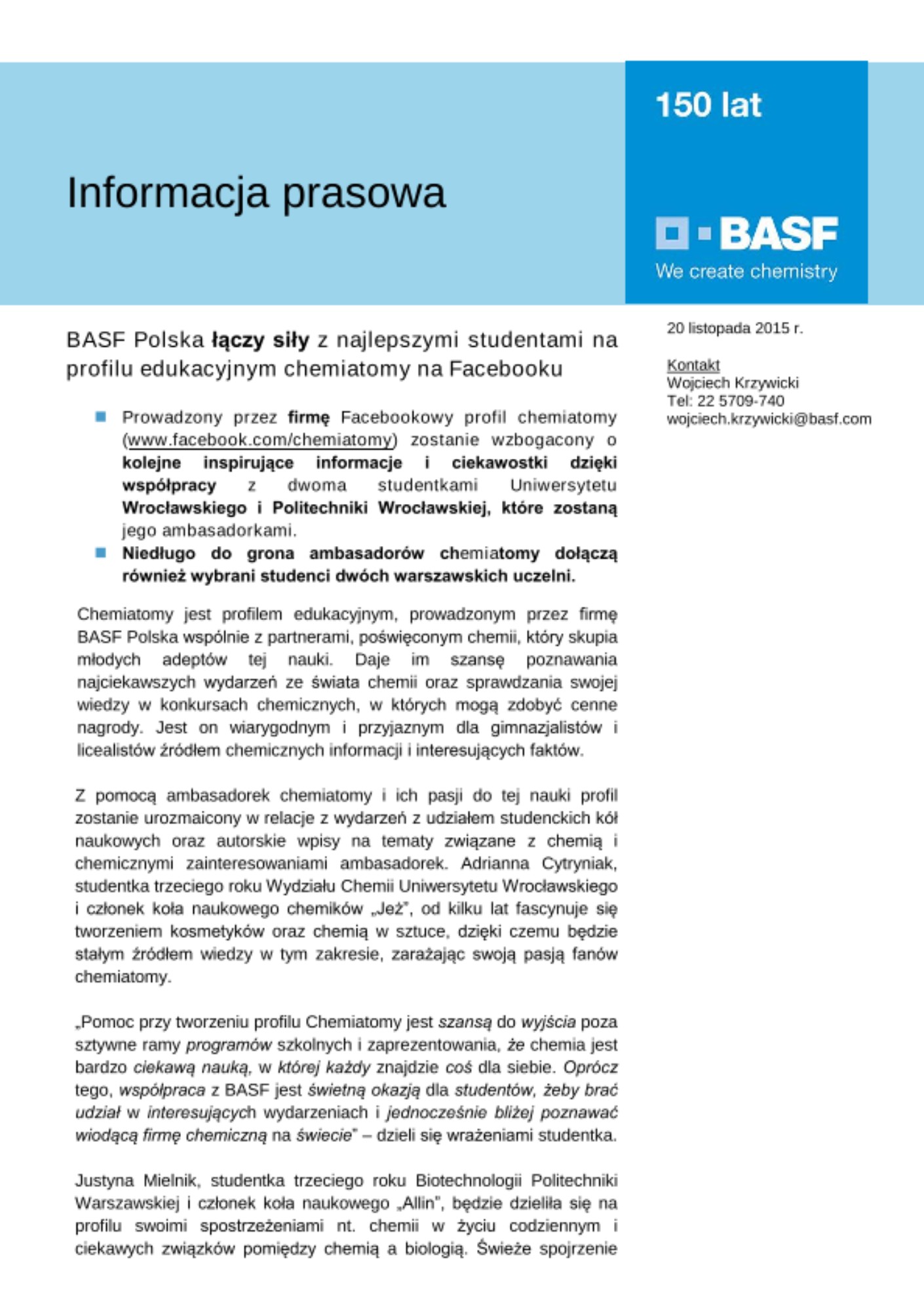 W 2015 roku firma BASF z okazji 150-lecia swojego istnienia nawiązała wyjątkową współpracę jubileuszową z wydziałami chemicznymi wiodących uczelni na Dolnym Śląsku – Uniwersytetu Wrocławskiego oraz Politechniki Wrocławskiej. Podobnie jak BASF, wydziały chemiczne tych uczelni obchodzą w 2015 roku okrągłe rocznice swojego istnienia. W ramach współpracy partnerskiej BASF Polska przez cały rok aktywnie uczestniczy w życiu akademickim, promując chemię wśród studentów. W maju firma wzięła udział w międzynarodowych regatach wioślarskich Odra River Cup, organizowanych przez Politechnikę Wrocławską, a we wrześniu pracownicy zakładu produkcji katalizatorów BASF w Środzie Śląskiej wystąpili z wykładem poświęconym chemii emisji samochodowych w ramach Dolnośląskiego Festiwalu Nauki – największego wydarzenia popularno-naukowego w Regionie. Współpracę jubileuszową uświetnił również wykład inauguracyjny Andreasa Gietla, Dyrektora Zarządzającego BASF Polska wygłoszony na Wydziale Chemicznym Politechniki Wrocławskiej. Przykłady współpracy można mnożyć – w ciągu roku jubileuszowego firma niejednokrotnie wystąpiła jako partner konferencji naukowych organizowanych przez Uniwersytet Wrocławski i Politechnikę Wrocławską. Podobną współpracę firma realizuje również z wydziałami chemicznymi dwóch uczelni warszawskich – Politechniki Warszawskiej i Uniwersytetu Warszawskiego. W najbliższym czasie grono ambasadorów profilu chemiatomy zostanie rozszerzone również o studentów tych uczelni.