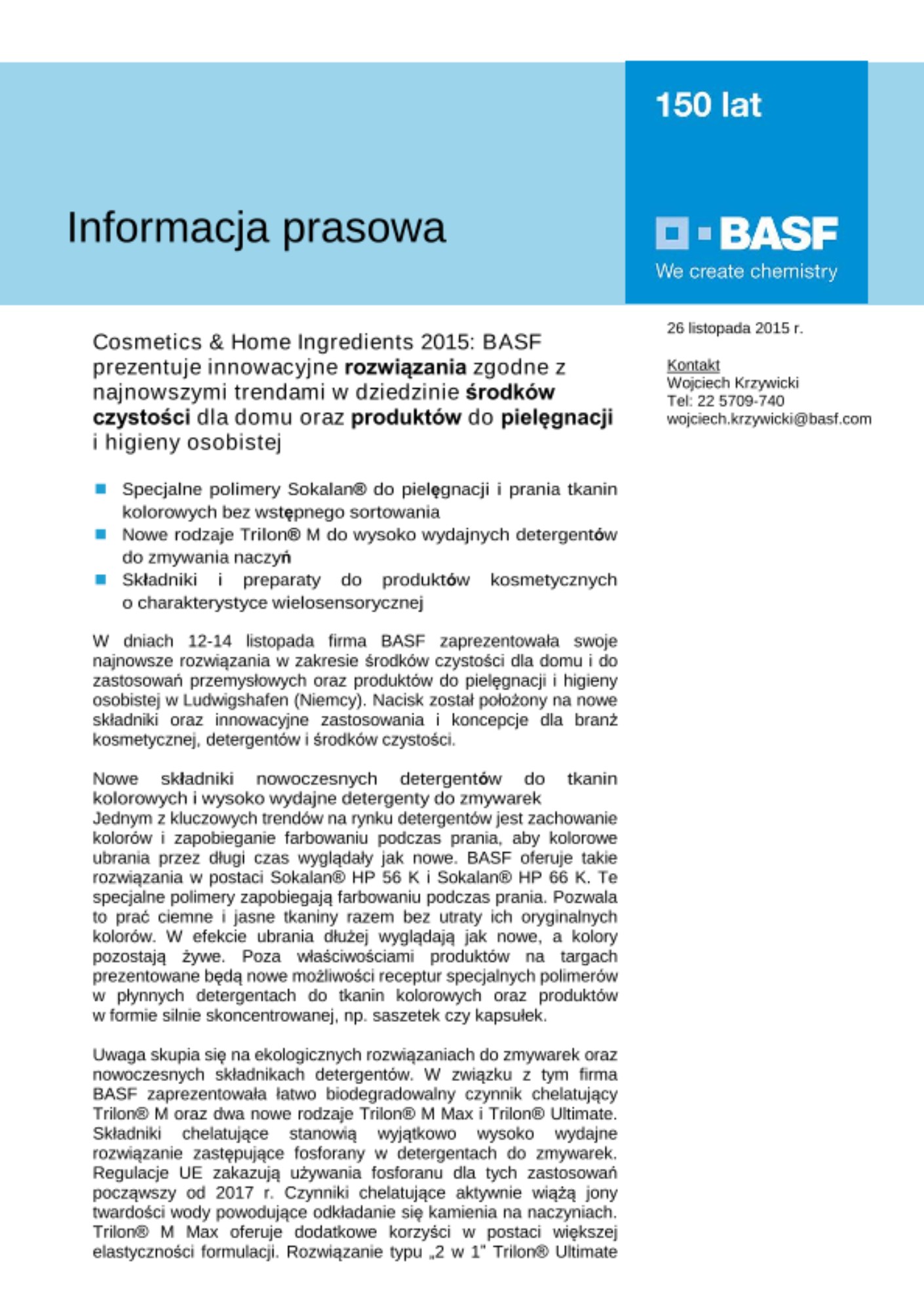 Jednym z kluczowych trendów na rynku detergentów jest zachowanie kolorów i zapobieganie farbowaniu podczas prania, aby kolorowe ubrania przez długi czas wyglądały jak nowe. BASF oferuje takie rozwiązania w postaci Sokalan® HP 56 K i Sokalan® HP 66 K. Te specjalne polimery zapobiegają farbowaniu podczas prania. Pozwala to prać ciemne i jasne tkaniny razem bez utraty ich oryginalnych kolorów. W efekcie ubrania dłużej wyglądają jak nowe, a kolory pozostają żywe. Poza właściwościami produktów na targach prezentowane będą nowe możliwości receptur specjalnych polimerów w płynnych detergentach do tkanin kolorowych oraz produktów w formie silnie skoncentrowanej, np. saszetek czy kapsułek.