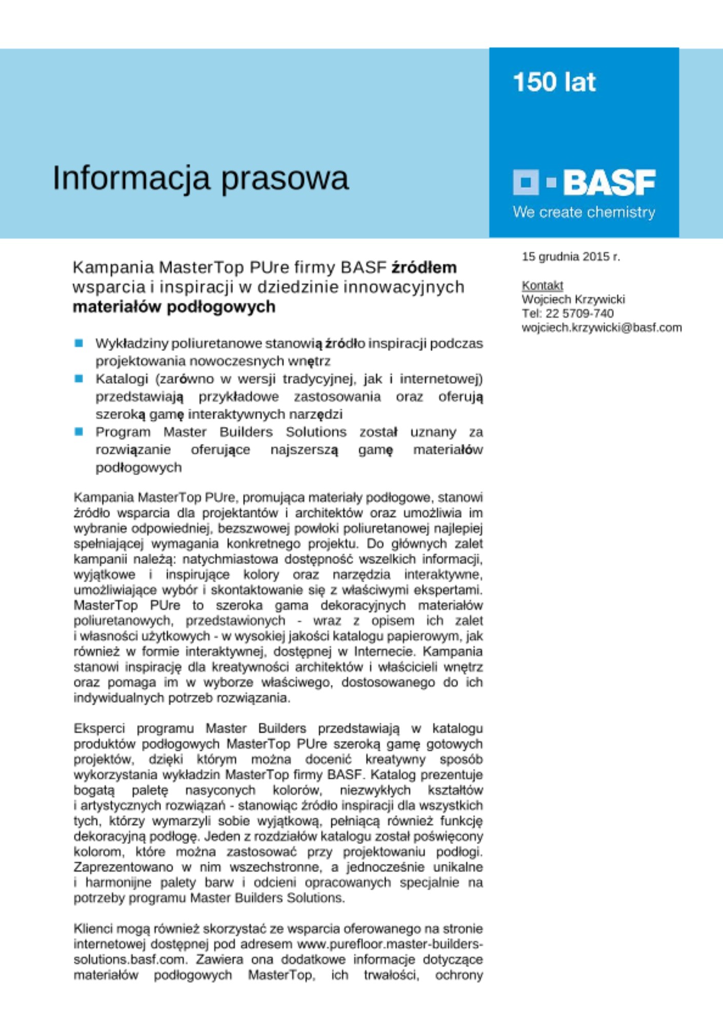 Kampania MasterTop PUre, promująca materiały podłogowe, stanowi źródło wsparcia dla projektantów i architektów oraz umożliwia im wybranie odpowiedniej, bezszwowej powłoki poliuretanowej najlepiej spełniającej wymagania konkretnego projektu. Do głównych zalet kampanii należą: natychmiastowa dostępność wszelkich informacji, wyjątkowe i inspirujące kolory oraz narzędzia interaktywne, umożliwiające wybór i skontaktowanie się z właściwymi ekspertami. MasterTop PUre to szeroka gama dekoracyjnych materiałów poliuretanowych, przedstawionych - wraz z opisem ich zalet i własności użytkowych - w wysokiej jakości katalogu papierowym, jak również w formie interaktywnej, dostępnej w Internecie. Kampania stanowi inspirację dla kreatywności architektów i właścicieli wnętrz oraz pomaga im w wyborze właściwego, dostosowanego do ich indywidualnych potrzeb rozwiązania.