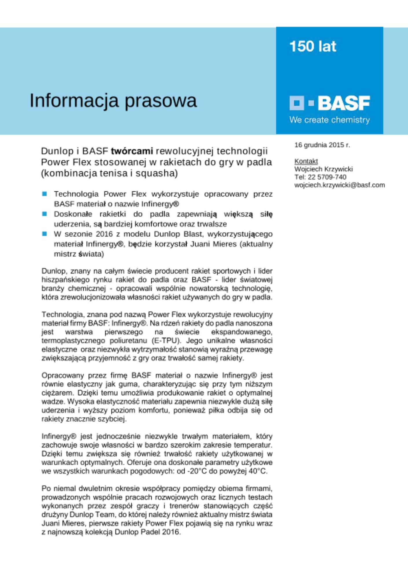 „Cieszymy się bardzo z opracowania technologii Power Flex wykorzystującej nasz ekspandowany, termoplastyczny poliuretan o nazwie Infinergy®. Współpraca w firmą Dunlop, która jest liderem światowego rynku sprzętu do gry w padla, umożliwia nam wykorzystanie naszej wiedzy i doświadczenia w zupełnie nowej dla nas dziedzinie” - zauważył Andy Postlethwaite, Senior Vice President, Performance Materials Asia Pacific, BASF.