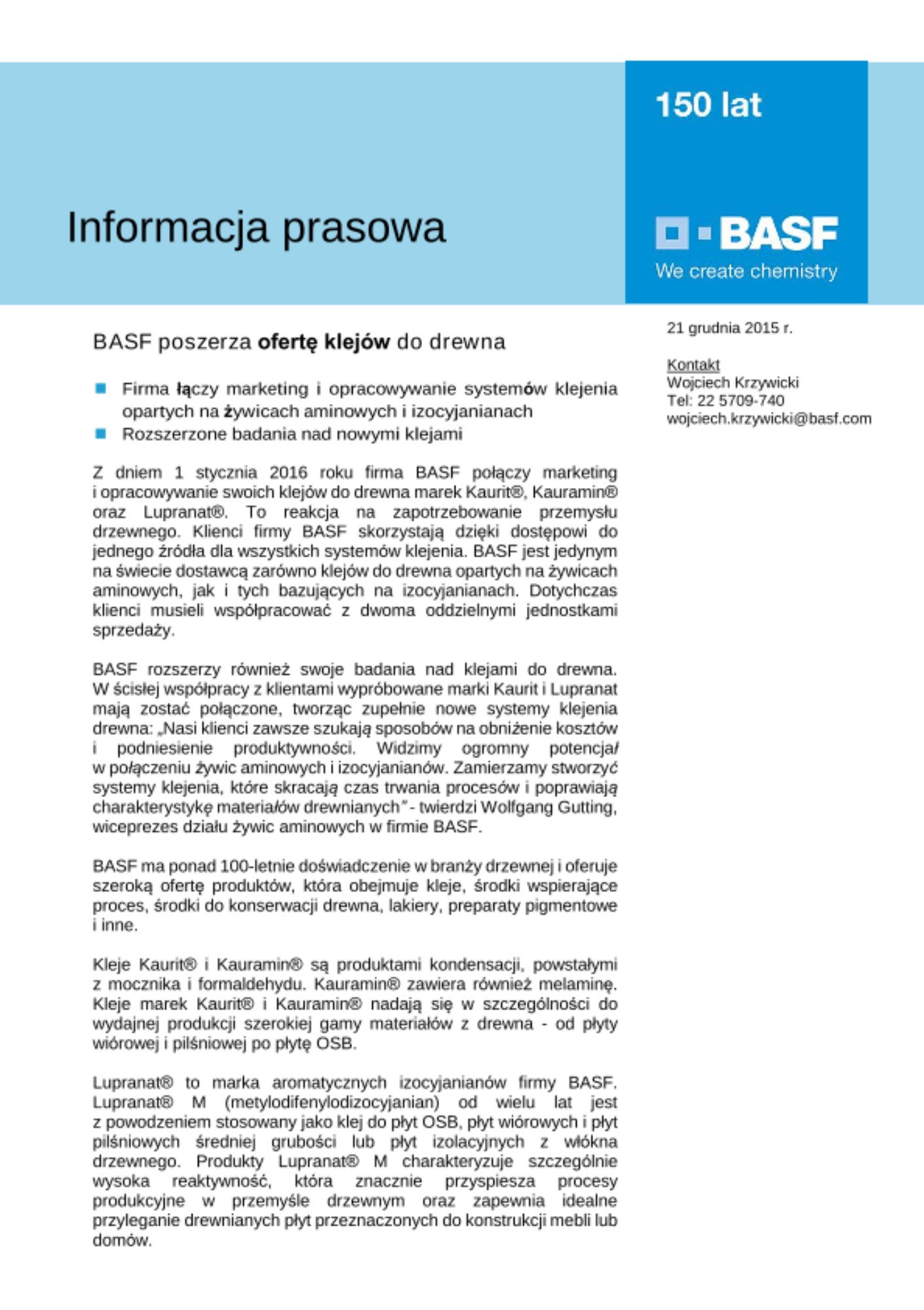 Z dniem 1 stycznia 2016 roku firma BASF połączy marketing i opracowywanie swoich klejów do drewna marek Kaurit®, Kauramin® oraz Lupranat®. To reakcja na zapotrzebowanie przemysłu drzewnego. Klienci firmy BASF skorzystają dzięki dostępowi do jednego źródła dla wszystkich systemów klejenia. BASF jest jedynym na świecie dostawcą zarówno klejów do drewna opartych na żywicach aminowych, jak i tych bazujących na izocyjanianach. Dotychczas klienci musieli współpracować z dwoma oddzielnymi jednostkami sprzedaży.
