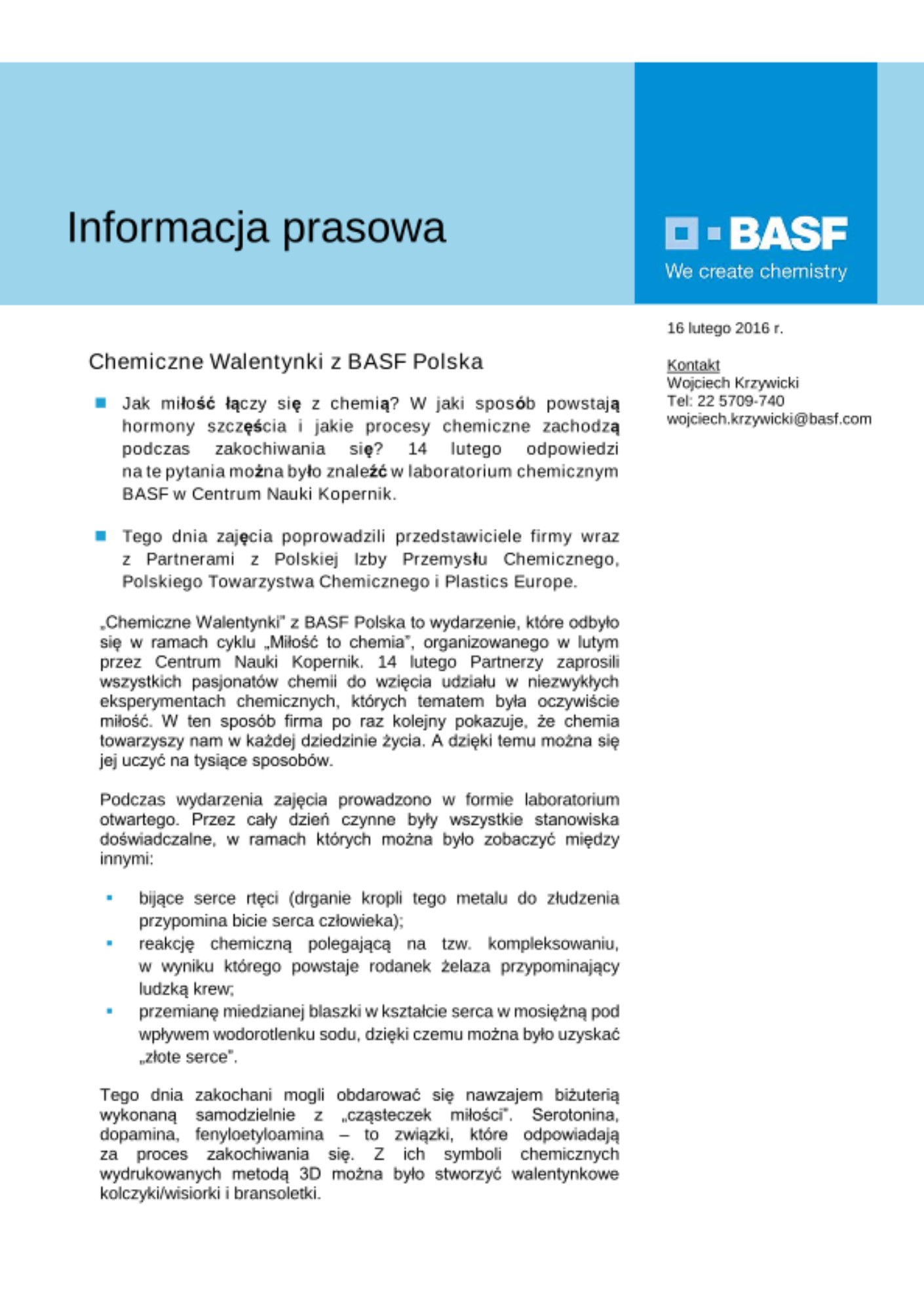 „Chemiczne Walentynki” z BASF Polska to wydarzenie, które odbyło się w ramach cyklu „Miłość to chemia”, organizowanego w lutym przez Centrum Nauki Kopernik. 14 lutego Partnerzy zaprosili wszystkich pasjonatów chemii do wzięcia udziału w niezwykłych eksperymentach chemicznych, których tematem była oczywiście miłość. W ten sposób firma po raz kolejny pokazuje, że chemia towarzyszy nam w każdej dziedzinie życia. A dzięki temu można się jej uczyć na tysiące sposobów.