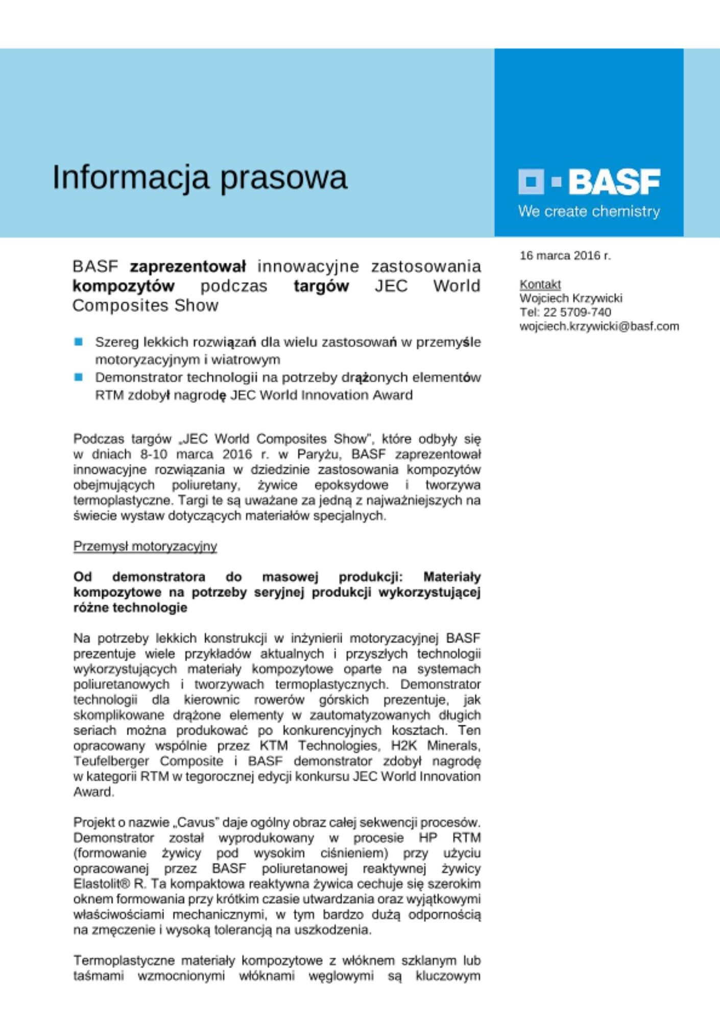 Podczas targów „JEC World Composites Show”, które odbyły się w dniach 8-10 marca 2016 r. w Paryżu, BASF zaprezentował innowacyjne rozwiązania w dziedzinie zastosowania kompozytów obejmujących poliuretany, żywice epoksydowe i tworzywa termoplastyczne. Targi te są uważane za jedną z najważniejszych na świecie wystaw dotyczących materiałów specjalnych.