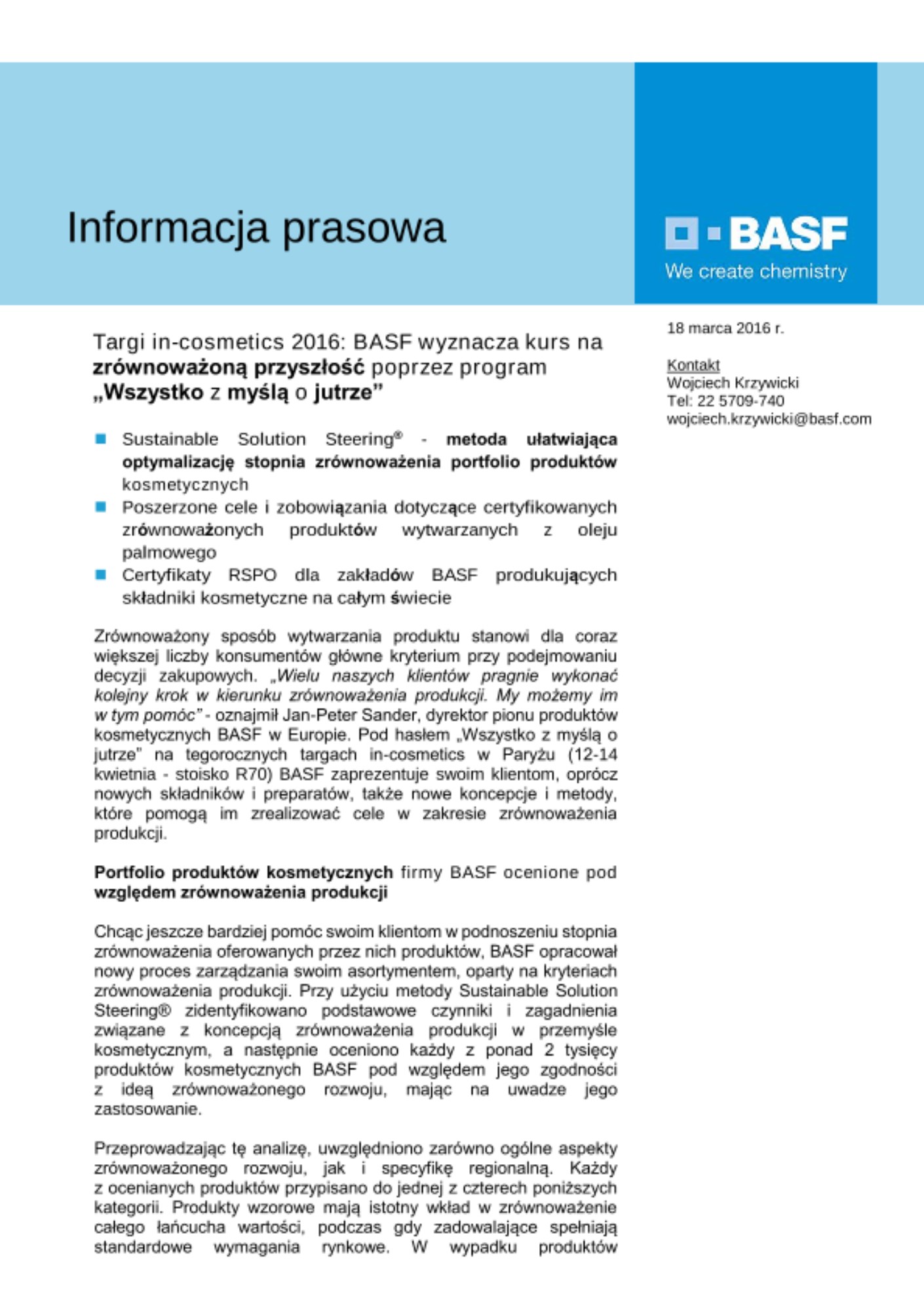 Zrównoważony sposób wytwarzania produktu stanowi dla coraz większej liczby konsumentów główne kryterium przy podejmowaniu decyzji zakupowych. „Wielu naszych klientów pragnie wykonać kolejny krok w kierunku zrównoważenia produkcji. My możemy im w tym pomóc” - oznajmił Jan-Peter Sander, dyrektor pionu produktów kosmetycznych BASF w Europie. Pod hasłem „Wszystko z myślą o jutrze” na tegorocznych targach in-cosmetics w Paryżu (12-14 kwietnia - stoisko R70) BASF zaprezentuje swoim klientom, oprócz nowych składników i preparatów, także nowe koncepcje i metody, które pomogą im zrealizować cele w zakresie zrównoważenia produkcji.